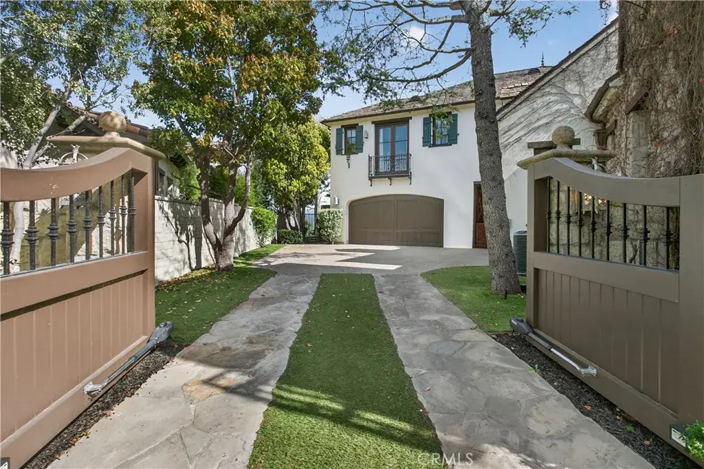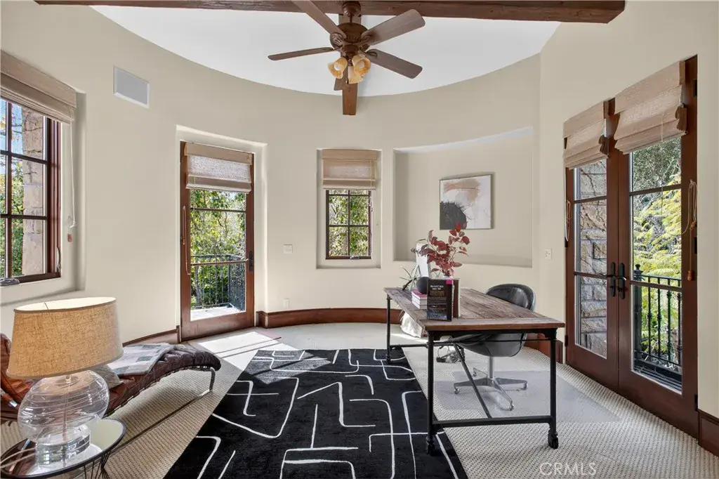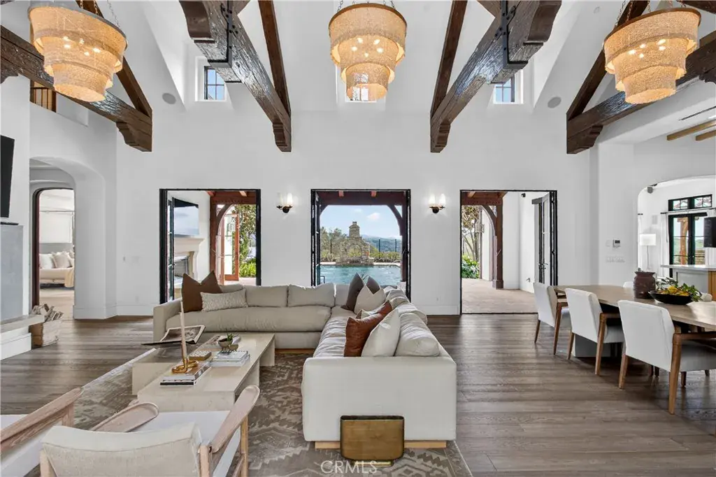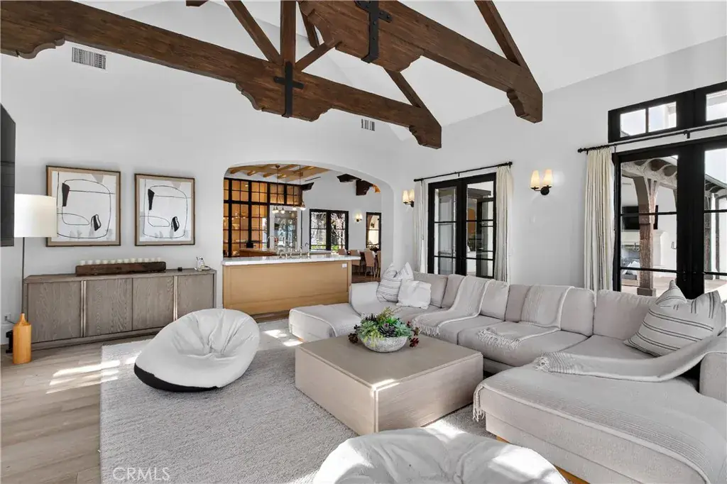 A gated entry leads to a serene courtyard where natural landscaping and a fountain set a tranquil tone. Inside, French oak floors, soaring cathedral ceilings, adorned with beautifully crafted beams and walls of French doors bathe the home in uplifting natural light, creating an inviting flow that blurs the line between indoors and out.