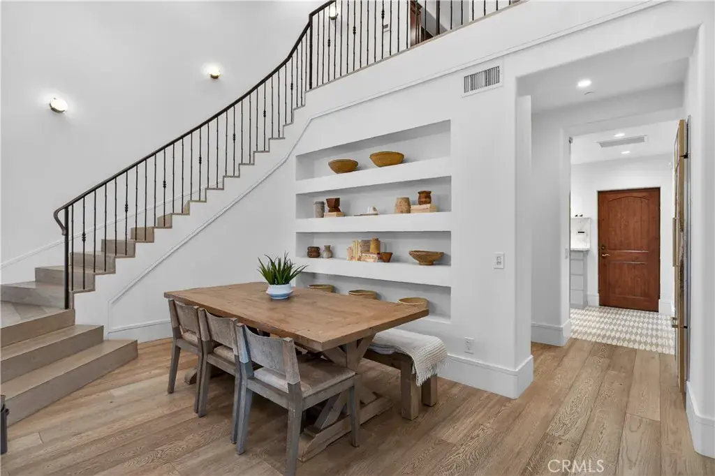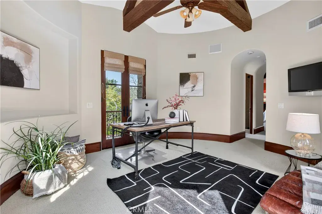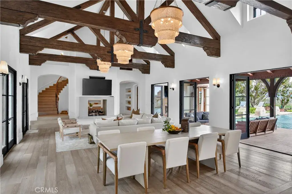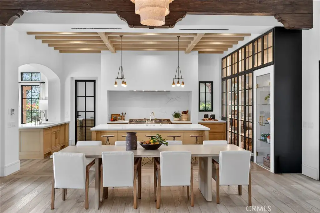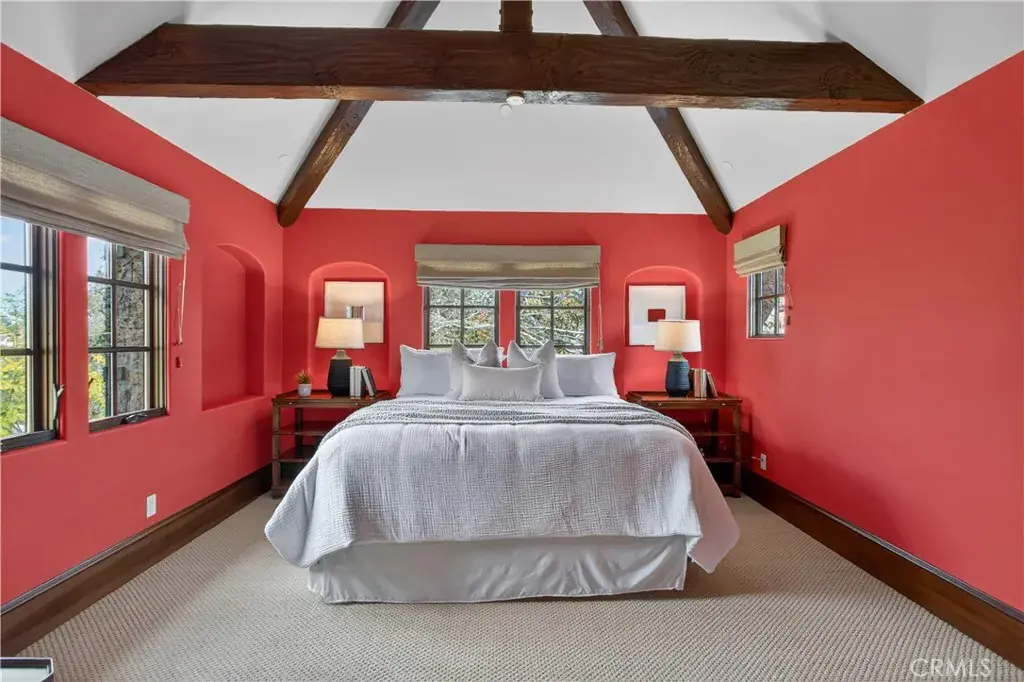 A gated entry leads to a serene courtyard where natural landscaping and a fountain set a tranquil tone. Inside, French oak floors, soaring cathedral ceilings, adorned with beautifully crafted beams and walls of French doors bathe the home in uplifting natural light, creating an inviting flow that blurs the line between indoors and out.