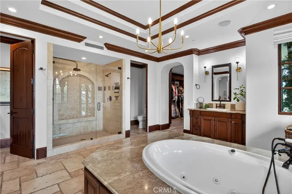 The main-floor primary suite is a private oasis with its own upstairs retreat—ideal for a nursery, gym, or office—plus a spacious walk-in closet with island. The spa-like bath features a jetted tub, separate shower, dual toilets, and a dedicated vanity.