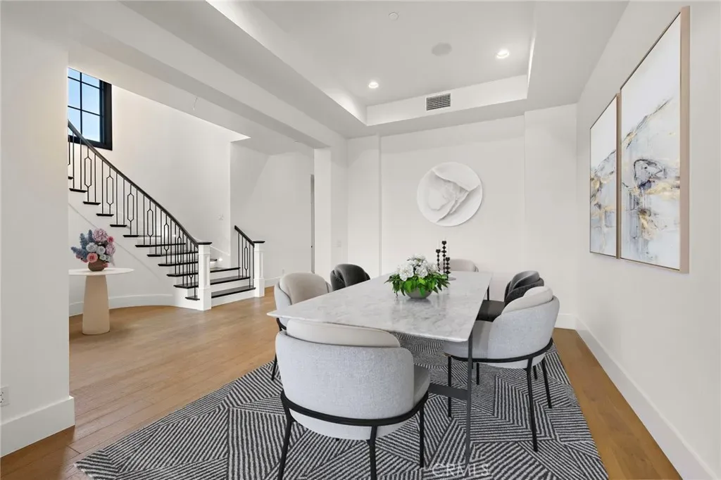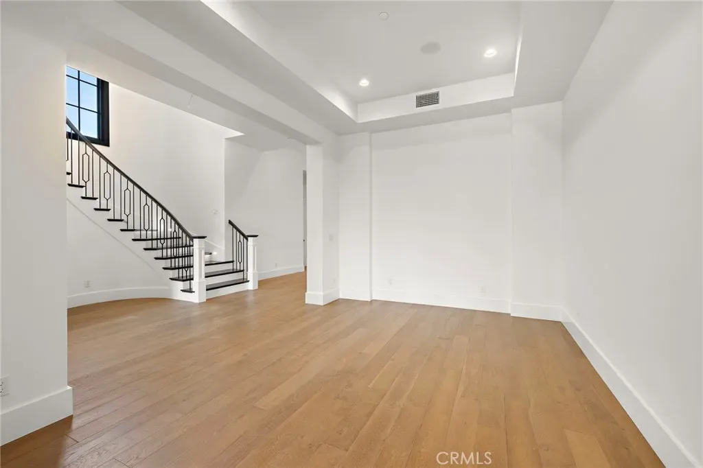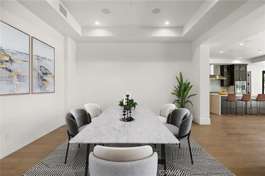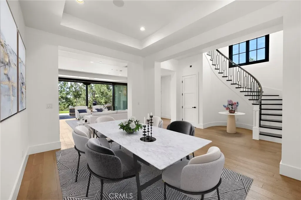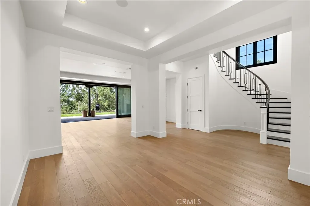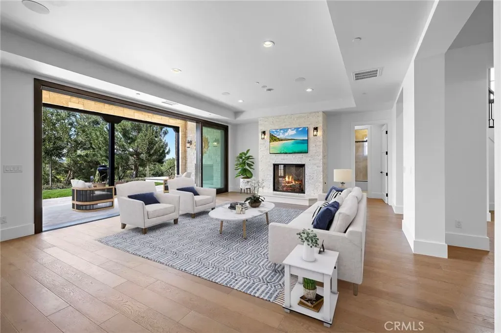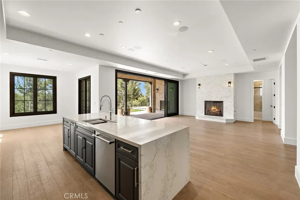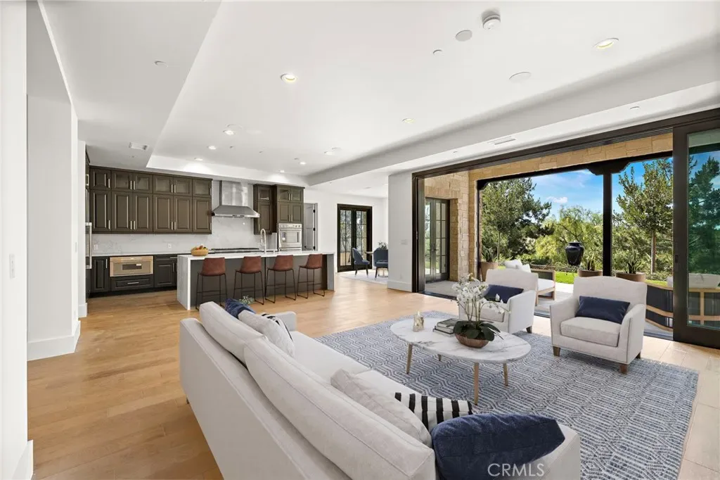 A meticulously curated landscape creates a striking first impression. Inside, approximately 4,090 square feet of refined living space blends grandeur with everyday comfort. The expansive great room showcases natural wood floors, an 8-zone surround sound system with whole-house monitoring and single-app control, and a warming fireplace. California doors create a seamless indoor-outdoor connection. Designed for both luxury and efficiency, the chef’s kitchen features premium Thermador appliances, a walk-in pantry, custom cabinetry, and a spacious dine-in area—ideal for casual mornings or elevated entertaining.