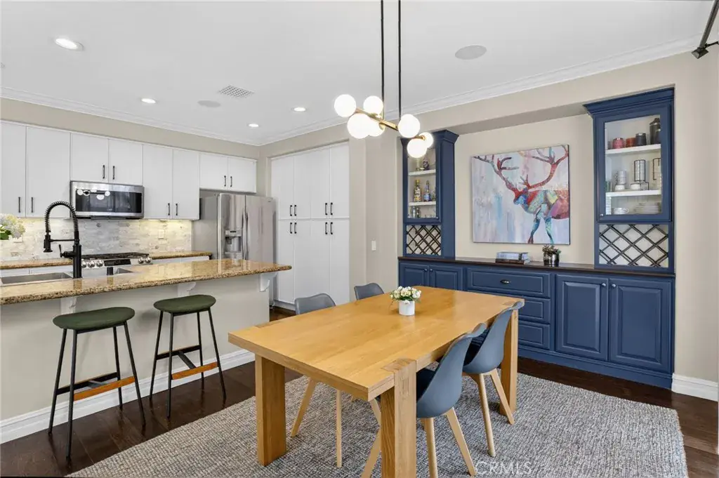 The kitchen is the heart of the home—featuring a large island, upgraded granite countertops, white slim shaker cabinetry, designer marble backsplash, newer appliances, a pantry, and an oversized dining area with built-in cabinetry that makes hosting feel easy and intentional.