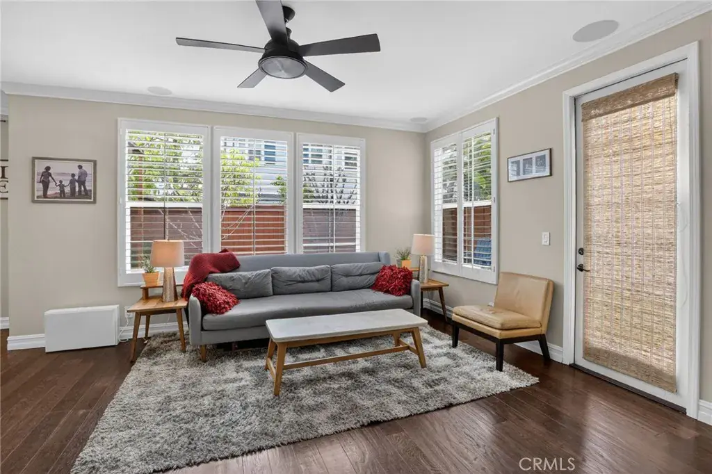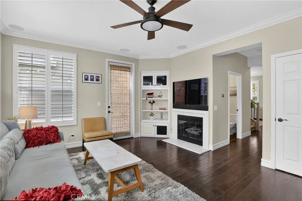 Spanning over 2,100 square feet, the two-story floorplan is open, functional, and designed for both everyday comfort and effortless entertaining. Rich dark hardwood floors, plantation shutters throughout, crown molding, smart LED lighting, built-in audio, and a full PEX repipe elevate the home’s look and long-term peace of mind. The living spaces flow naturally, anchored by a welcoming family room with a built-in entertainment center, surround sound, and fireplace.