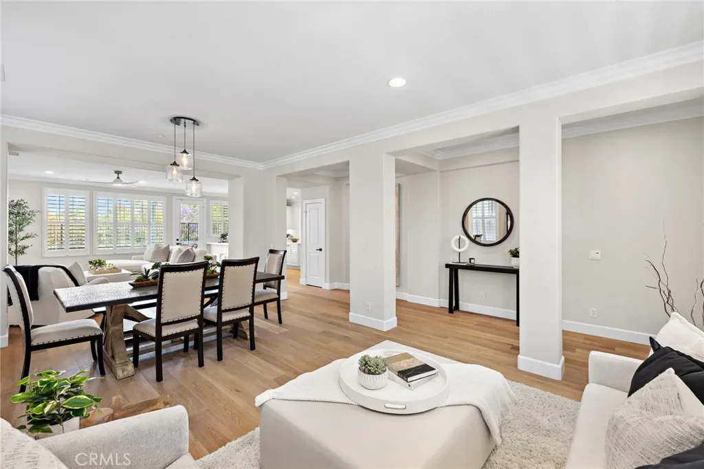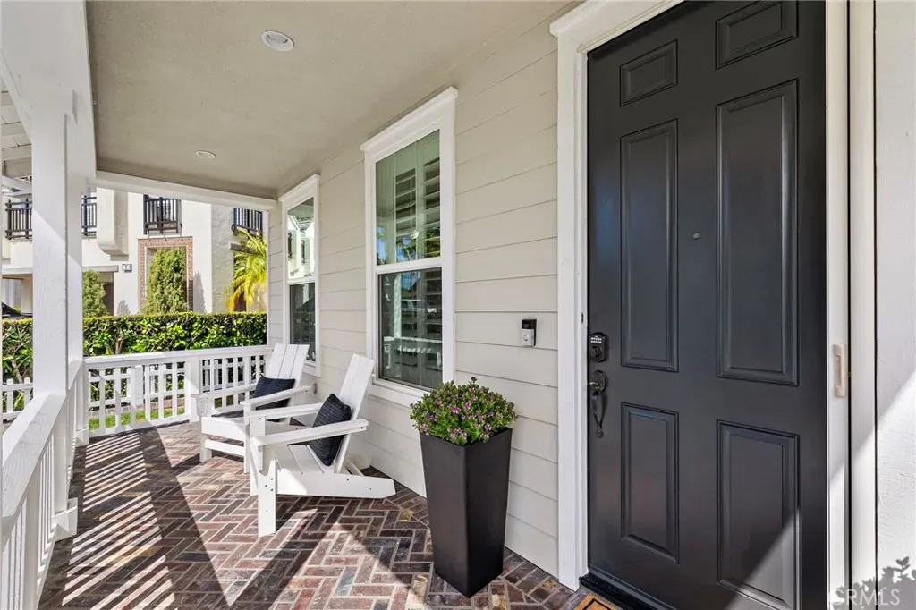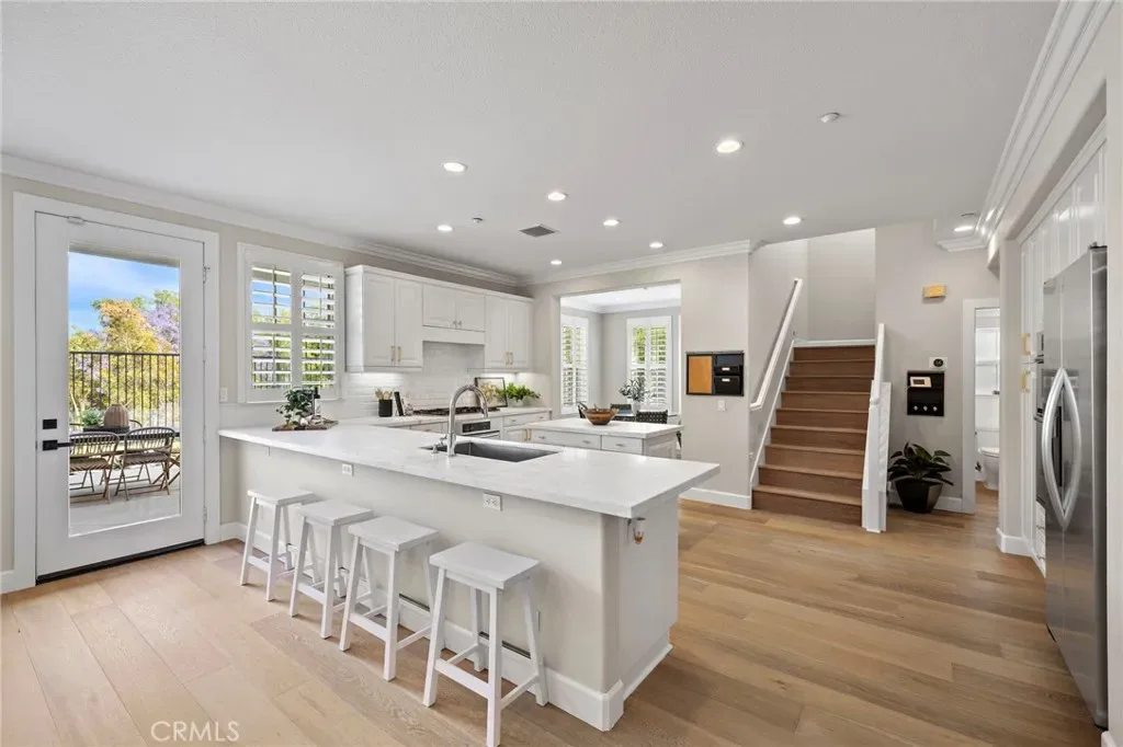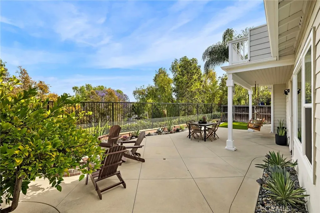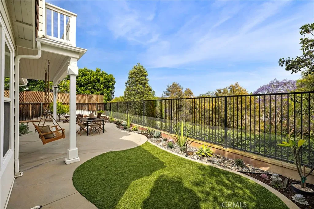 Welcome to 8 St. Steven Court, a beautifully upgraded residence nestled on a quiet cul-de-sac in the heart of Ladera Ranch. Showcasing panoramic views and a thoughtfully designed layout, this 4-bedroom, 2.5-bath home offers a refined blend of comfort, thoughtful design, and elevated living. White oak hardwood flooring, new carpet in bedrooms, and a light-filled interior are complemented by crown molding, upgraded baseboards, plantation shutters, and designer hardware throughout. Designed for both style and functionality, the kitchen features Calcutta marble countertops, a full tile backsplash, stainless steel appliances including refrigerator, an oversized single basin sink, a center island, and a peninsula with breakfast bar seating. The adjacent morning room offers built-in hutch cabinetry, adding charm and additional storage. Flowing seamlessly into the main living areas, the kitchen creates an ideal setting for both daily living and entertaining. Upstairs, the primary suite offers a luxurious retreat, complete with a spacious walk-in closet and a remodeled bath featuring dual sinks, quartz countertops, designer fixtures and lighting, a freestanding soaking tub, and a walk-in shower with custom tile surrounds and a frameless glass door with updated hardware. Secondary bedrooms are generously sized, with two additional walk-in closets, while all closets throughout the home feature adjustable Elfa organization systems. Additional features include an upstairs laundry room with utility sink and built-in cabinetry, a whole house fan, smart thermostats, wireless alarm system with motion sensor, Ring cameras, MyQ garage access, keyless entry, and a water softener. Recent improvements include a new water heater and rain gutters. The finished garage is fully equipped with epoxy flooring, built-in cabinetry, overhead storage, a wall-mounted TV with cable, fluorescent lighting, and dual retractable screen doors. Step outside to a private backyard with panoramic views, a deck off the primary suite, and an outdoor gas firepit, complemented by drought-tolerant landscaping with artificial turf, drip irrigation, and low-voltage landscape lighting. The elevated lot offers a rare vantage point to enjoy seasonal fireworks and surrounding scenery. Enjoy close proximity to Founder’s Park, Ladera Ranch Elementary and Middle School, and a variety of local community events. This home delivers location, quality upgrades, and everyday functionality tailored for modern living.