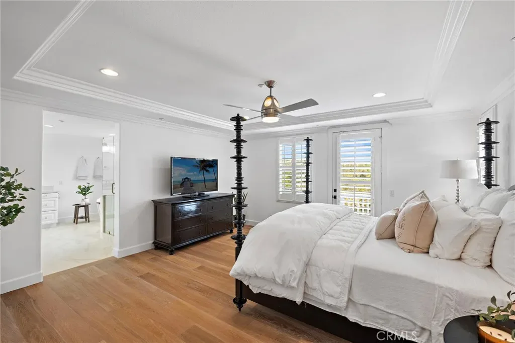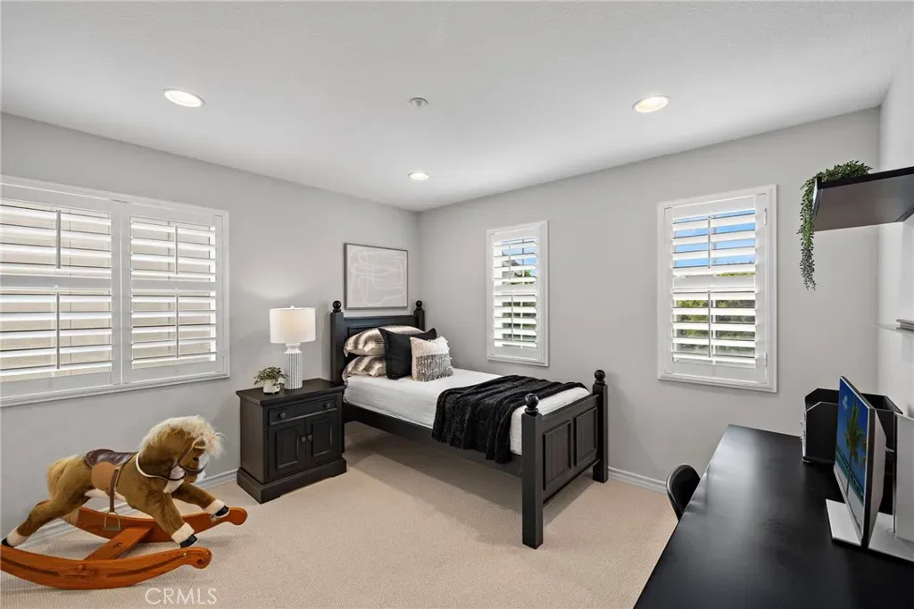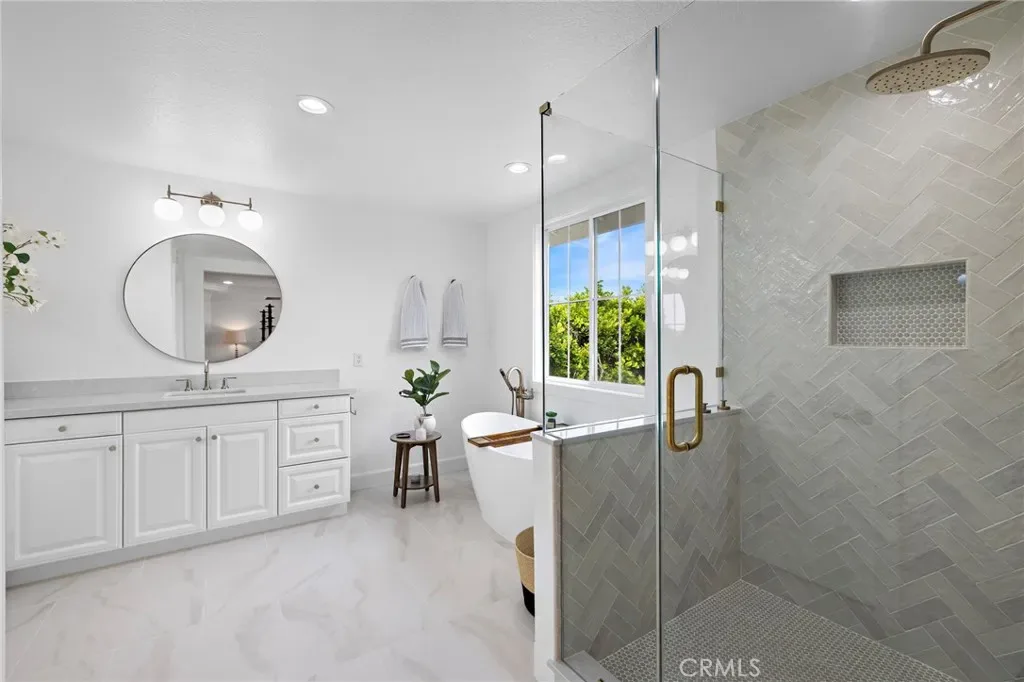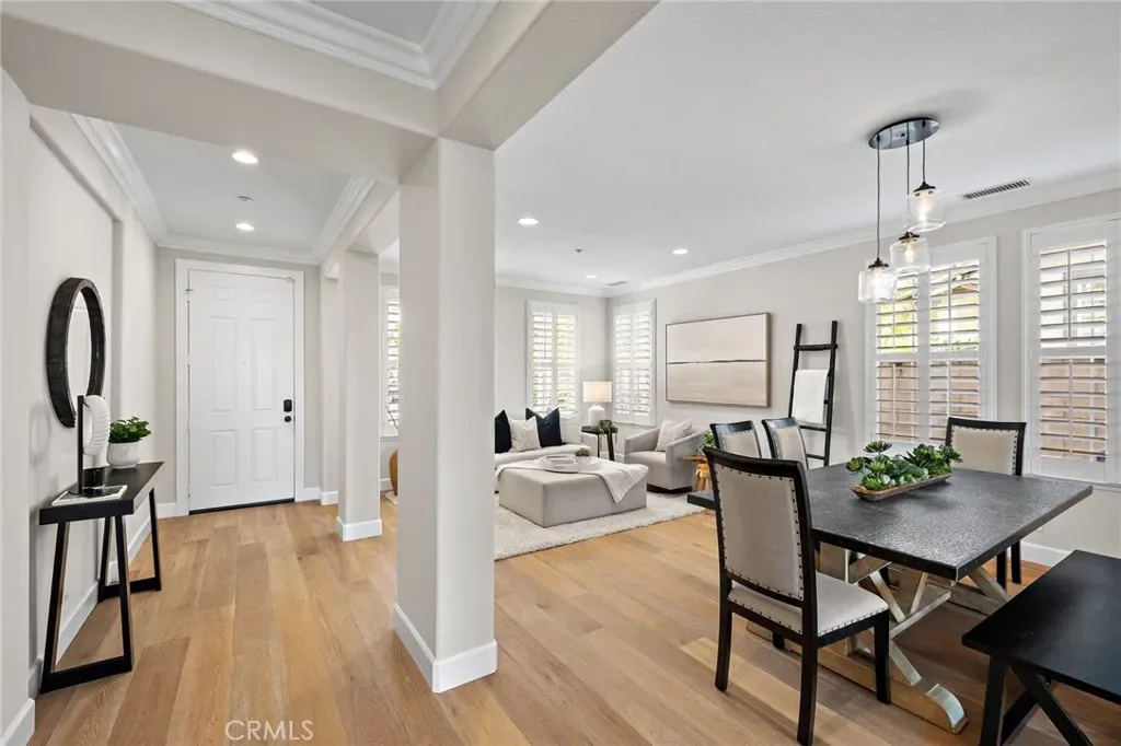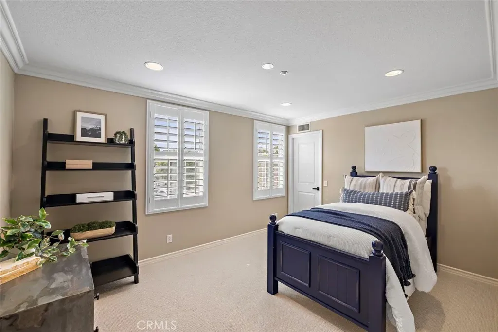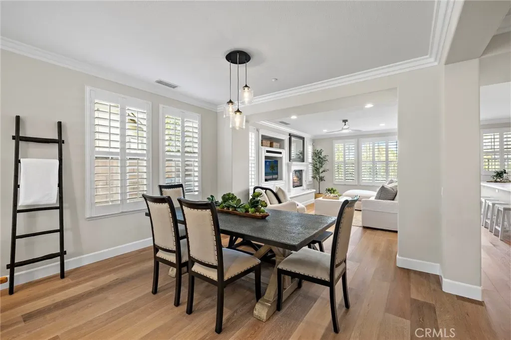 Welcome to 8 St. Steven Court, a beautifully upgraded residence nestled on a quiet cul-de-sac in the heart of Ladera Ranch. Showcasing panoramic views and a thoughtfully designed layout, this 4-bedroom, 2.5-bath home offers a refined blend of comfort, thoughtful design, and elevated living. White oak hardwood flooring, new carpet in bedrooms, and a light-filled interior are complemented by crown molding, upgraded baseboards, plantation shutters, and designer hardware throughout. Designed for both style and functionality, the kitchen features Calcutta marble countertops, a full tile backsplash, stainless steel appliances including refrigerator, an oversized single basin sink, a center island, and a peninsula with breakfast bar seating. The adjacent morning room offers built-in hutch cabinetry, adding charm and additional storage. Flowing seamlessly into the main living areas, the kitchen creates an ideal setting for both daily living and entertaining. Upstairs, the primary suite offers a luxurious retreat, complete with a spacious walk-in closet and a remodeled bath featuring dual sinks, quartz countertops, designer fixtures and lighting, a freestanding soaking tub, and a walk-in shower with custom tile surrounds and a frameless glass door with updated hardware. Secondary bedrooms are generously sized, with two additional walk-in closets, while all closets throughout the home feature adjustable Elfa organization systems. Additional features include an upstairs laundry room with utility sink and built-in cabinetry, a whole house fan, smart thermostats, wireless alarm system with motion sensor, Ring cameras, MyQ garage access, keyless entry, and a water softener. Recent improvements include a new water heater and rain gutters. The finished garage is fully equipped with epoxy flooring, built-in cabinetry, overhead storage, a wall-mounted TV with cable, fluorescent lighting, and dual retractable screen doors. Step outside to a private backyard with panoramic views, a deck off the primary suite, and an outdoor gas firepit, complemented by drought-tolerant landscaping with artificial turf, drip irrigation, and low-voltage landscape lighting. The elevated lot offers a rare vantage point to enjoy seasonal fireworks and surrounding scenery. Enjoy close proximity to Founder’s Park, Ladera Ranch Elementary and Middle School, and a variety of local community events. This home delivers location, quality upgrades, and everyday functionality tailored for modern living.