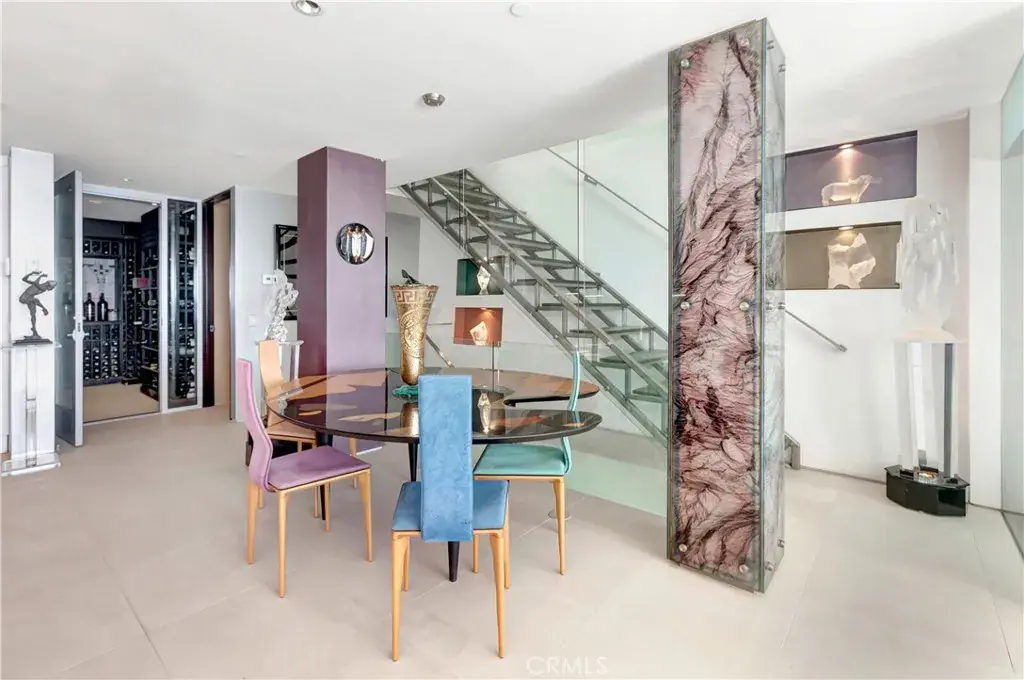 Designed by an award-winning Horst architects and masterfully constructed in 2004 of steel, concrete, and glass, the home spans approximately 3,500 square feet across four dramatic levels, each embracing panoramic ocean views that stretch endlessly across the horizon. A private elevator glides between floors, offering effortless access from the sand level to the top floor office.