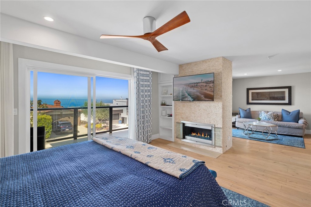 The primary suite offers a private sanctuary with a fireplace, sitting area with workstation, walk-in closet, private view terrace, and a spa-inspired bath with soaking tub. Two additional remodeled bedrooms share an updated full bath and open to a terrace that leads to an outdoor family room—ideal for intimate gatherings or quiet moments.