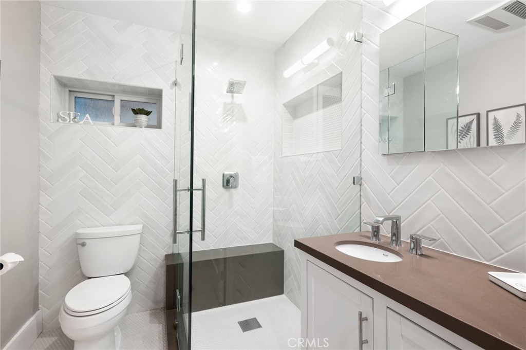 The lower level provides a versatile space suited for a guest suite or home office, along with a remodeled bath with walk-in shower, laundry room, and additional storage.