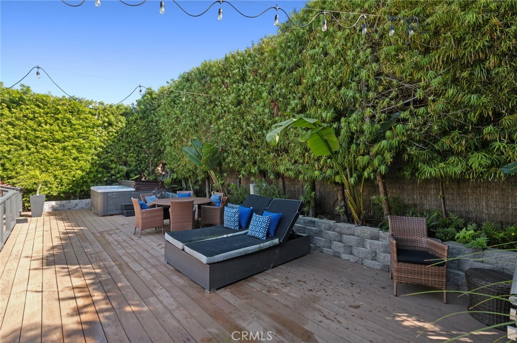 The modern chef’s kitchen is beautifully appointed with Thermador appliances and flows effortlessly into the main entertaining areas. A secondary living room/bonus space opens through French doors to a thoughtfully designed multi-level backyard retreat, highlighted by a Brazilian wood deck and framed by mature privacy hedging. This inviting outdoor setting is ideal for sun-filled afternoons, al fresco dining, or relaxing in the spa under the stars.