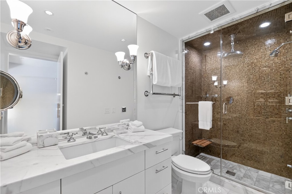 The kitchen is equipped with granite counters, top-of-the-line Viking, Miele, and Sub Zero appliances, including a wine cooler, and walnut cabinets with frosted glass panel doors illuminated by interior lighting. The master and guest bedrooms feature custom-built white cabinets, and the luxurious baths are finished with stone counter tops, tiled showers, and heated floors. The master bath even has a steam shower and heated towel racks, while the guest bath includes a shower and separate tub. Custom window coverings are found throughout, including automated shades in the living room and storm shutters on the first and second levels. The Sonos sound system provides a high-quality audio experience.