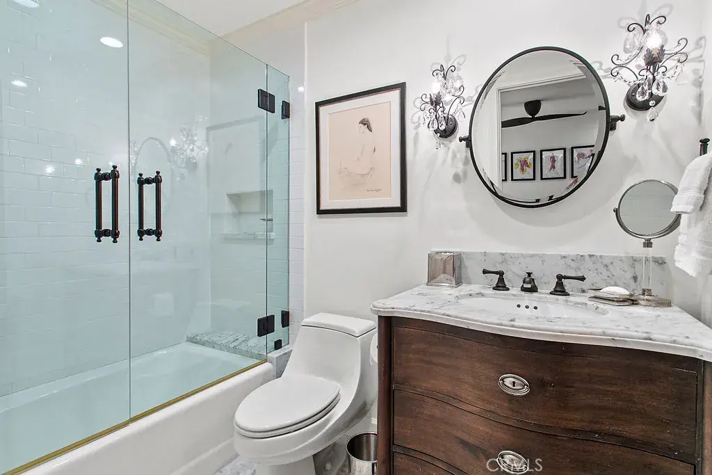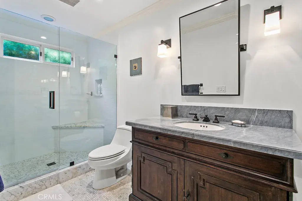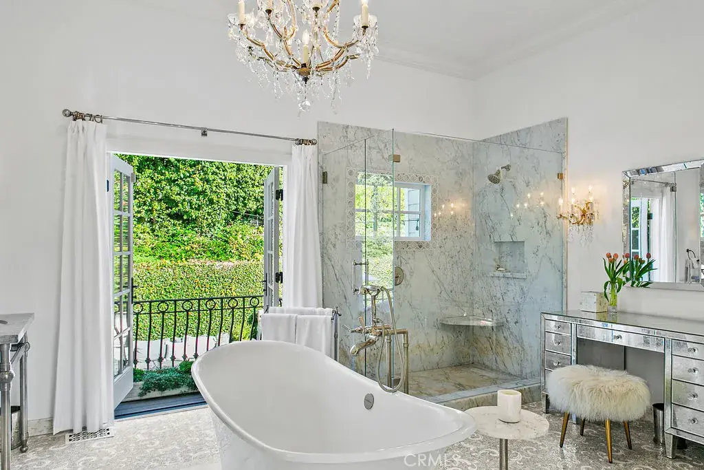 The main-level primary suite serves as a private retreat, with fireplace, walk in closet, and a spa-inspired marble bathroom. Glass doors from the bedroom open to an ocean-facing terrace, while the bathroom offers garden views with a balcony leading you to the private spa, fire pit lounge, and professional-grade outdoor kitchen, creating a seamless indoor-outdoor experience— your own resort setting overlooking the coastline.