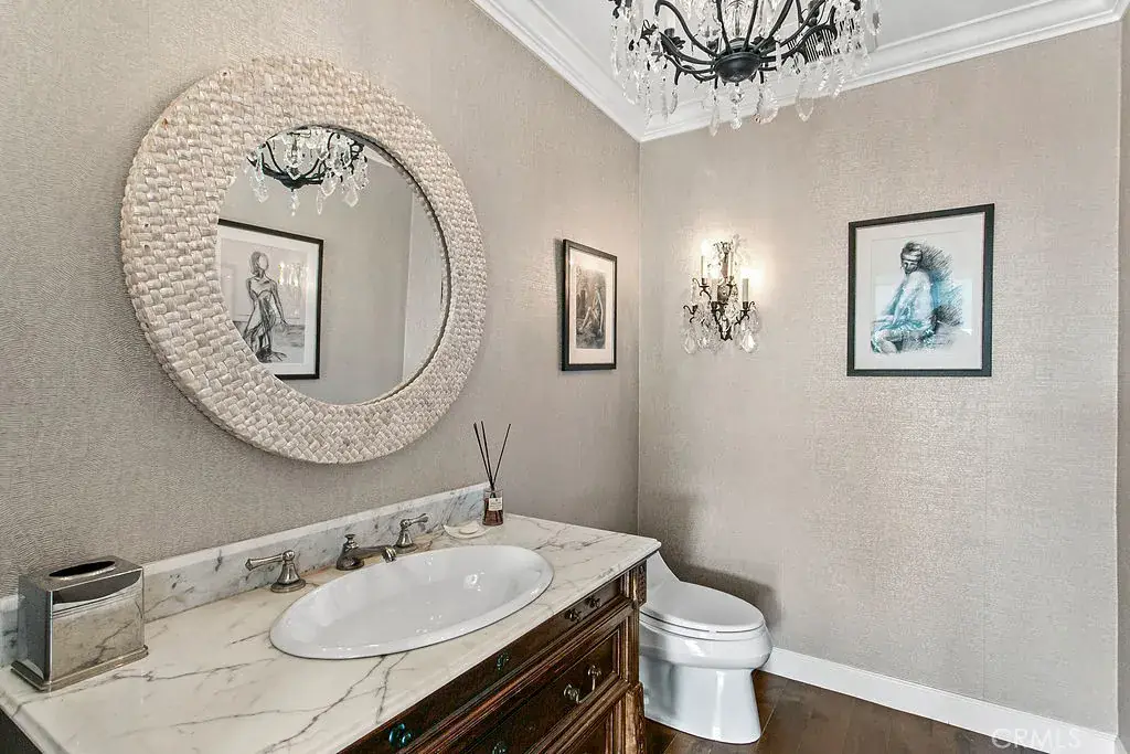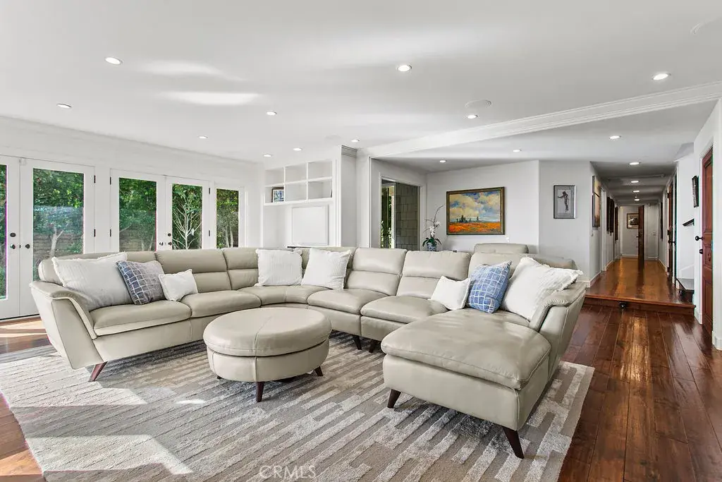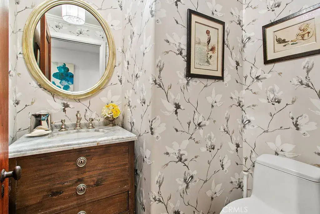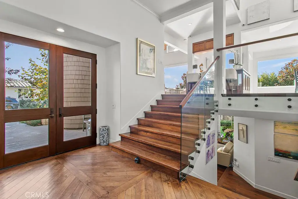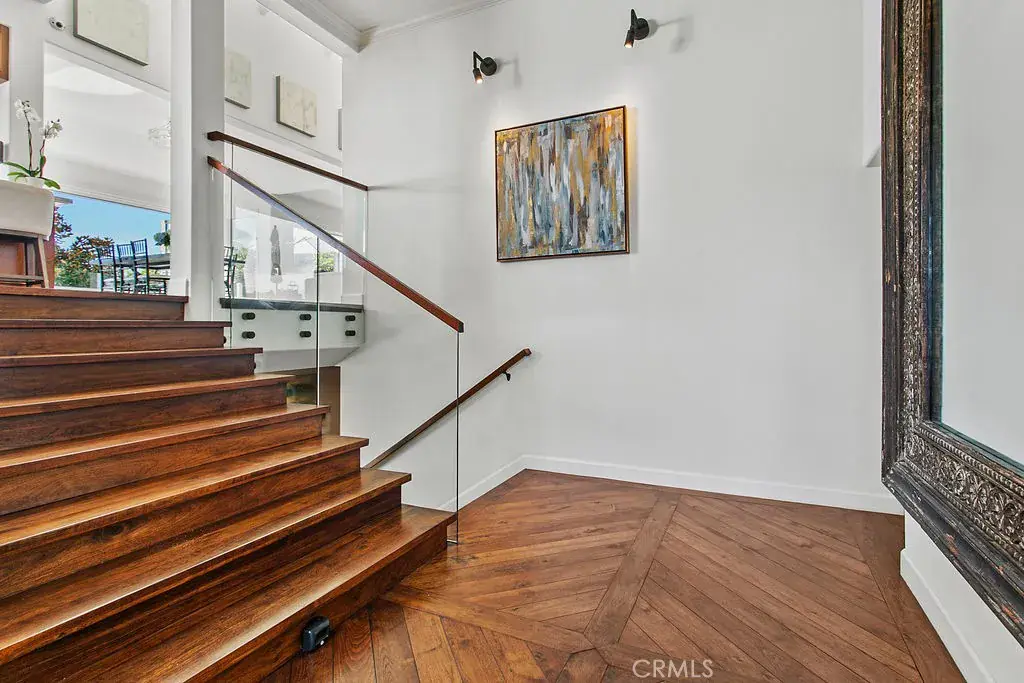 On the lower level, three generously scaled bedroom suites each feature private baths and direct access to a lush, level lawn—an exceptional offering along the Laguna coastline. Additional spaces include a refined library, a sunlit family room with dramatic ocean views, a dedicated home office, and a large-scale laundry room designed for effortless living. Powder rooms on each floor provide added convenience for hosting.