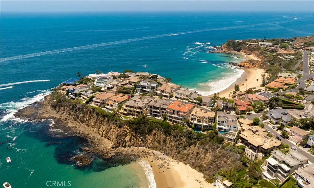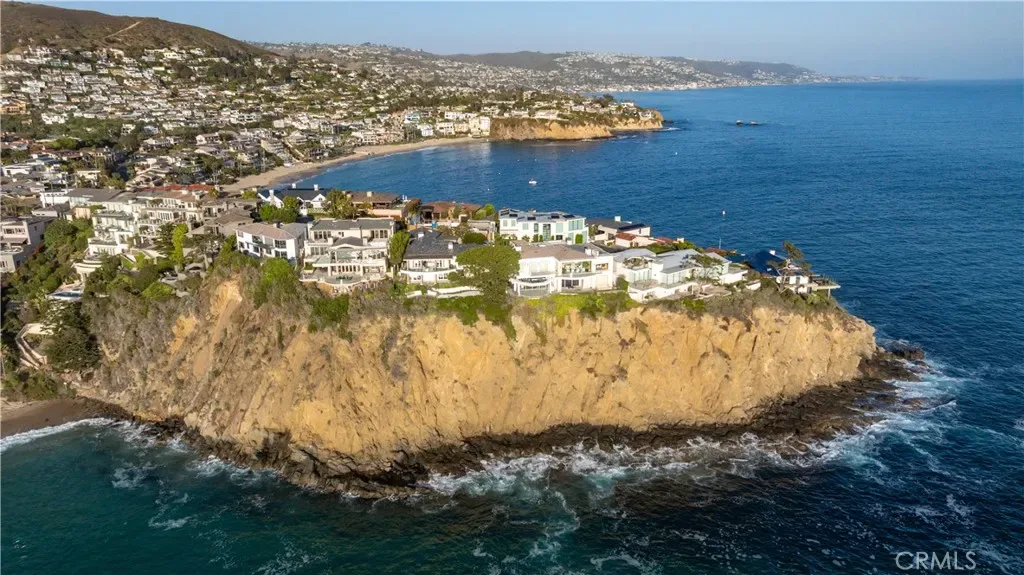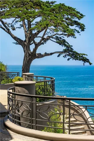 Resting at the end of a quiet cul-de-sac in Emerald Bay—Orange County’s premier private, guard-gated oceanfront enclave—this exceptionally rare oceanfront residence commands a singular oversized parcel with unobstructed surfline, cove, Catalina Island, and sunset views. The home is deliberately private, buffered from neighbors, and organized around dramatic, high-volume interiors that maximize the coastal panorama. A two-story entry sets the tone, leading to main living spaces on a single level: a great room, formal dining room, expansive family room or office, theater, and an oversized kitchen with oceanfront dining. All open seamlessly to a generous seaside terrace—one of the property’s defining features.The terraced grounds descend toward the water’s edge, featuring broad stone terraces, gardens, a seaside spa, and lawn; all anchored by nearly century-old Monterey cypress. The master suite occupies much of an entire floor, discreetly separated from secondary bedrooms, and enjoys amazing water vistas. An elevator serves all levels, with ample garage and off-street parking for residents and guests. A private gated path and staircase provide direct, exclusive access to the cove below—an uncommon privilege. Emerald Bay remains inimitable under current restrictions: a secure oceanfront community that enjoys nearly a half-mile of pristine private beach, parks, tennis courts, swimming facilities, volleyball, and other amenities in coveted North Laguna Beach. Its residents enjoy a lifestyle that is unmatched along the coast of Southern California. This is a rare opportunity to own a generously scaled oceanfront residence overlooking one of the world’s most scenic coastlines.
