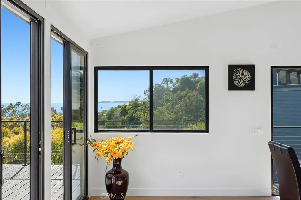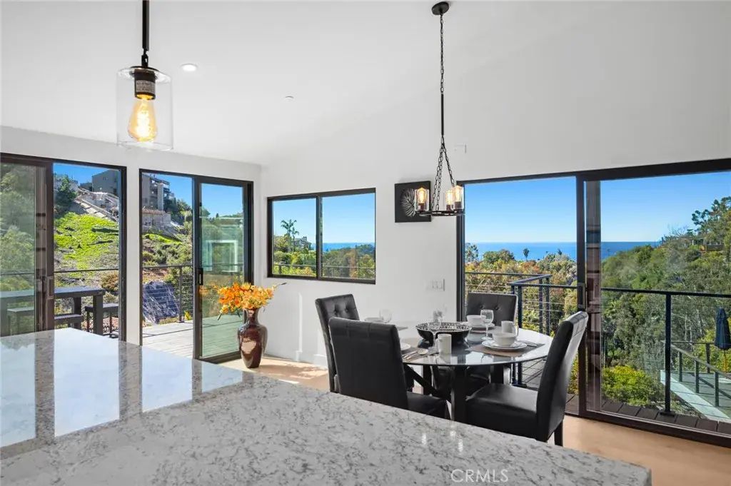Embraced by a beautiful setting with ocean and canyon views on a cul-de-sac homesite, this spectacular single-level, fully upgraded residence effortlessly blends indoor-outdoor living in a delightful environment that enhances every aspect of your lifestyle. Enjoy relaxed days, special moments, and unforgettable occasions with the ones you love in an open and inviting design that offers three bedrooms and two bathrooms across approximately 1,286 square feet. This open-concept home, upgraded in 2024, provides the perfect backdrop for coastal living, starting with an inviting oversized ocean-view front deck that sets the tone. Inside, a beautifully arranged dining, kitchen, and family area is designed for both elegance and ease. Vaulted ceilings and brand-new Milgard windows frame sweeping views, extending from the fireplace-warmed living room to the coastal-view dining space—an ideal setting for entertaining. The expansive wraparound deck continues the living experience outdoors, where vibrant sunsets and Catalina Island views create a truly magical ambiance. The chef’s kitchen is both functional and refined, featuring stone countertops, custom cabinetry, and a center island with charming breakfast seating. High-end Bosch appliances, including a built-in 6-burner range, complete the space seamlessly. The tranquil primary suite offers a peaceful retreat with a luxurious bath that includes a double vanity, a tub, and a separate shower. Two additional bedrooms and a bathroom, with a walk-in shower, provide comfort and flexibility for guests or family. Bathed in natural light and cooled by gentle ocean breezes, the home also boasts extensive upgrades, including all-new plumbing and electrical systems, a new roof, a new HVAC system, a new tankless water heater, and an electric car charger. Ample parking is available in the driveway, located just beyond the two-car garage. This gorgeous, move-in-ready home is just moments from the upscale boutiques, galleries, cafés, and restaurants of Laguna Beach’s vibrant Village. Pristine beaches, romantic coves, and scenic hiking trails are nearby, enriching a coastal lifestyle that you’ll treasure for generations to come.