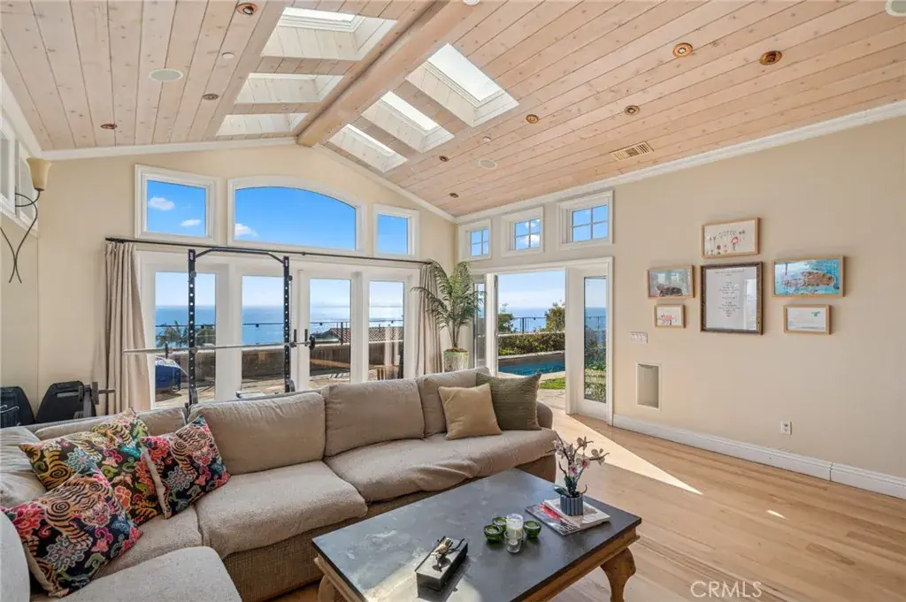 This residence is designed for effortless indoor-outdoor living. Lounge by the private pool, dine al fresco in the outdoor chef’s kitchen, or unwind on expansive view terraces overlooking Emerald Bay, Catalina Island, and year-round sunsets. The main-level living room and gourmet kitchen open seamlessly to an ocean-view terrace, creating the ultimate entertaining space.