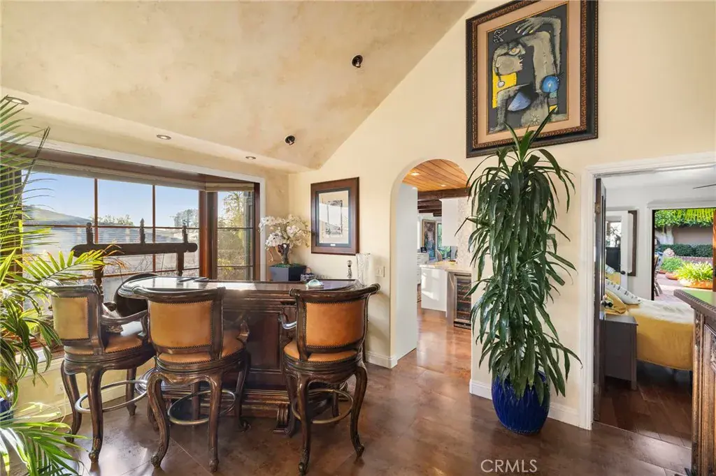 The chef’s kitchen is equipped with a Wolf dual-fuel range and convection oven, warming drawer, professional-grade appliances, wine refrigerator, and an alkaline purified water system. Spacious indoor and outdoor dining areas flow seamlessly, complemented by a bar in the ocean-view living room.