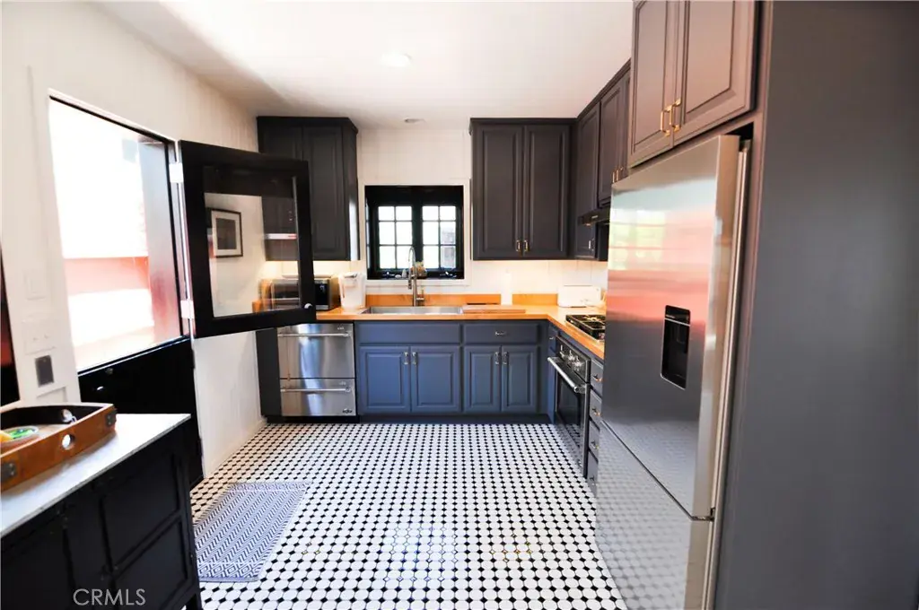 Step inside to find a spacious living room with high beamed ceilings, a cozy fireplace, and beautiful hardwood floors. The updated kitchen boasts high-end appliances, perfect for culinary enthusiasts. Each bedroom features its own bathroom, providing comfort and privacy.