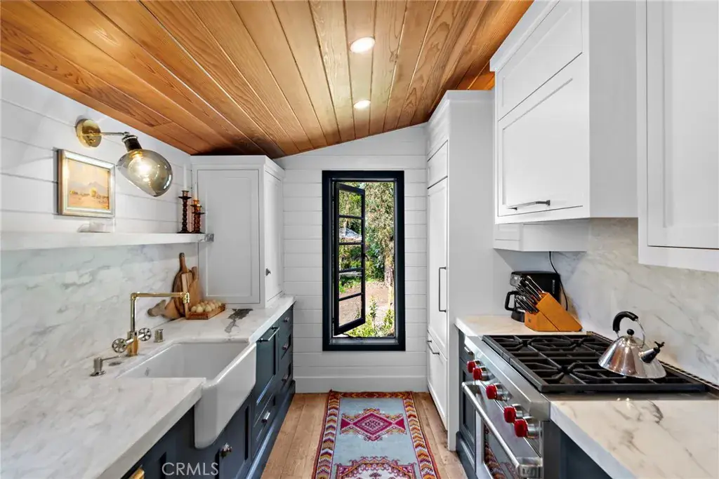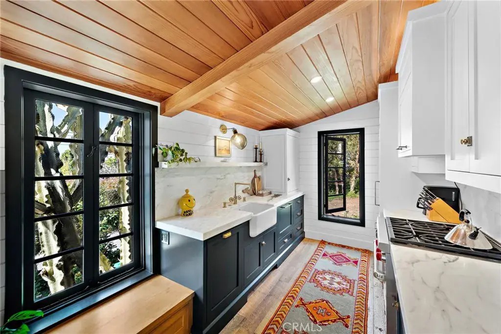 The gourmet kitchen is a chef’s dream, equipped with a Wolf stove, Sub-Zero refrigerator, drawer dishwasher, and a charming built-in dining booth—perfect for intimate meals.