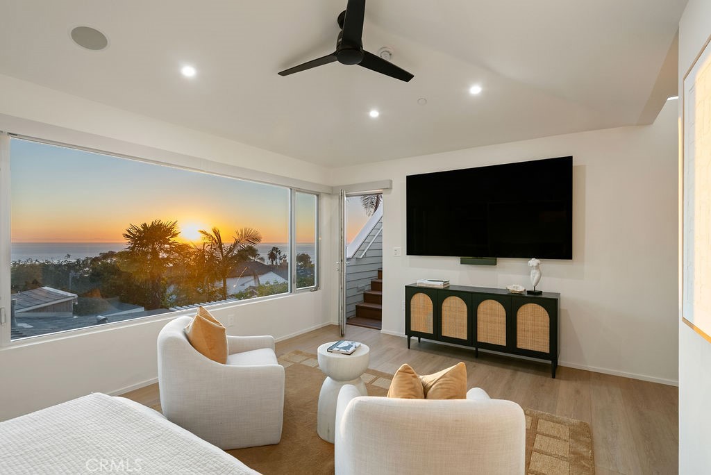 Tucked away on a quiet cul-de-sac just steps from the beach, this beautifully updated home offers the ideal blend of privacy, coastal living, ocean views, and modern design in the heart of South Laguna. The home is thoughtfully designed across multiple levels, emphasizing maximized space, natural light, and functionality. High ceilings, expansive windows, and thoughtful details, such as barn doors and custom built-ins, create a bright, airy feel that lives larger than its footprint. Tall windows and sliding glass doors surround the main living area, creating an inviting atmosphere with a seamless connection to the beautifully landscaped outdoors. A sleek, updated kitchen features a quartz peninsula, high-end appliances, custom cabinetry, and refined finishes, flowing into the living space complete with a statement fireplace, surround sound, Lutron lighting, and motorized blinds. Just off the kitchen, a dedicated laundry and storage room adds everyday convenience. The lower level includes a spacious private guest bedroom with tall glass sliders and windows. The primary suite occupies its own level, offering soaring ceilings, abundant natural light, a beautifully remodeled bath, and stunning ocean views. Perched just above this level, the expansive rooftop deck captures an awe-inspiring panoramic ocean view. This creates the perfect space for entertaining, featuring a built-in weatherproof TV, refrigerator, and retractable awning for year-round comfort and privacy. Additional property highlights include an outdoor shower, central A/C, recessed lighting, a spacious one-car garage with EV charging, and driveway parking. A smart home camera system provides exterior coverage, motion alerts, and real-time access from your phone. Located just moments from world-class beaches, snorkeling, hiking and biking trails, renowned restaurants, top-rated schools and luxury resorts, this home offers the very best of the Laguna Beach lifestyle.