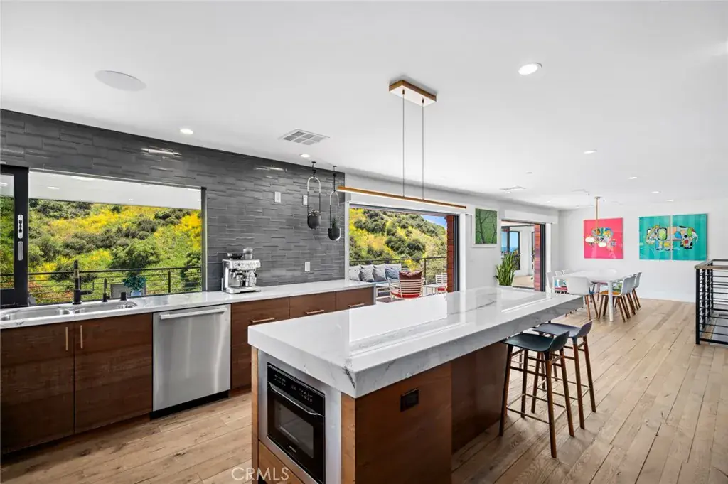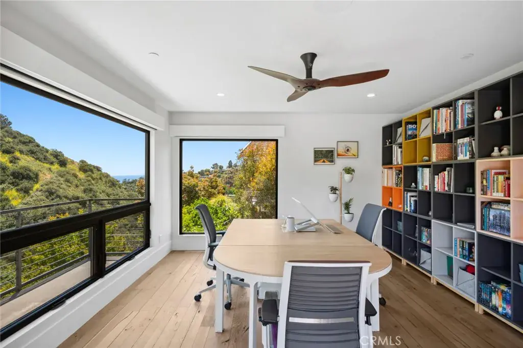 Showcasing a modern design aesthetic with exceptional architecture inside and out, this custom Laguna Beach home brings the beauty and serenity of canyon and evening-light views into fabulously open living spaces. Located on an enormous homesite of more than 53,000 square feet at the end of a cul-de-sac just moments from the vibrancy of Laguna Village, the residence reveals lush landscaping that complements stone, wood and steel exterior materials. A large glass entry door opens to a stunning interior where an organic blend of cohesive elements is embellished with on-trend decor. An abundance of natural light streams through vast windows and slide-away pocket doors, creating a seamless indoor/outdoor ambiance while illuminating approximately 5,420 square feet that includes five bedrooms, four of which are en suite, and seven baths. Each level offers easy access to the outdoors, with the main floor’s dining room, fireplace-warmed living areas, and kitchen flowing to a deck to create one large and open living space.Imagine the memories created while entertaining friends and loved ones during special celebrations, all with tranquil canyon vistas as a peaceful backdrop. Custom wood cabinetry and Mont Blanc quartzite countertops capture the eye in a kitchen with oversized island, open shelving and a full tile backsplash. Top appliances include a six-burner Thermador range and a built-in refrigerator and dishwasher from Miele. A junior primary suite and an ocean-view office with deck access are also featured on this floor,giving it the feel of single-level living.Follow a dramatic floating staircase to the second floor, which hosts a family room, secondary suites and the primary suite.For the ultimate in personal luxury, this grand suite is refined with generous proportions. Opening to the deck, the suite hosts a fireplace and a walk-in closet with custom built-ins.The primary bath is infused with the feel of a five-star resort,complete with freestanding tub, oversized shower, two sinks and gorgeous stone finishes.The lowest level is primed for entertaining with a game/media room, fireplace, wet bar,378-bottle wine cellar, guest suite,and a towering two-story wall of glass.Solar power,a standing-seam metal roof, and an attached two-car garage are joined by ample guest parking. Minutes to the sand, top-rated schools, galleries,restaurants and trails,this showplace captures the unique energy of Laguna Beach in one special place that you will be proud to call home.