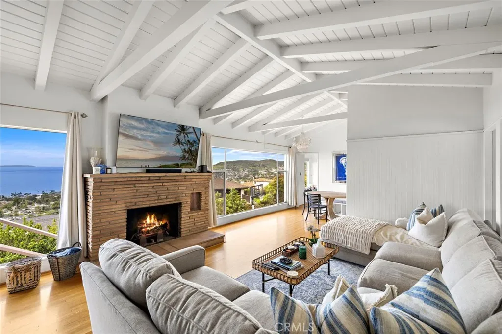 Amazing panoramic ocean views, iconic Catalina sunsets, and the vibrant charm of near by Main Beach and the Village. This location rarely comes on the market! It not only has incredible views, tucked away and is only a short distance to the beach. This beautifully situated home combines timeless character with modern comforts. Two story floorplan, upstairs, you’ll find two bedrooms and two baths, charming wood beamed living room and of course spectacular ocean views. Downstairs there is a spacious guest suite with a 3/4 bath perfect for a family room or guest suite which offers great versatility. Downstairs could also be used as a large office with bathroom and a separate entry. The interior boasts hardwood floors, two cozy fireplaces (one on each level), and charming kitchen and stainless steel appliances. Step outside to a generous large lot with a private rear patio and lush gardens—ideal for entertaining, soaking up the sun, or cultivating your green thumb. Don’t forget the oversized two-car garage with space for a golf cart. This home has great possibilities for a large addition and remodel to your specifications. All this, just a short distance to Thalia Street Beach, shops and dining. With stunning Catalina and San Clemente island ocean views and an unbeatable location, this home is a rare find. Don’t miss your chance to make it yours!