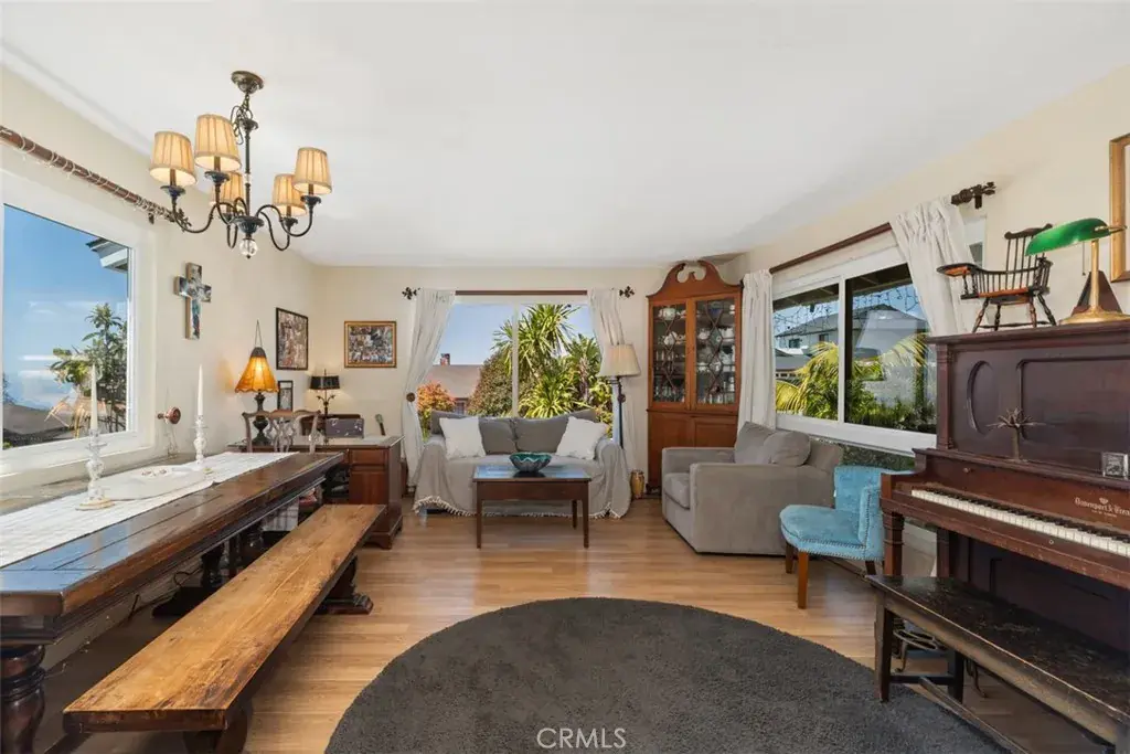 Upon arrival, you’ll be greeted by a charming courtyard entrance adorned with palm trees and a cozy seating area. Step inside to discover a warm and inviting living room filled with character, featuring stunning antique furniture, an elegant piano, and large windows that showcase the home’s captivating views.