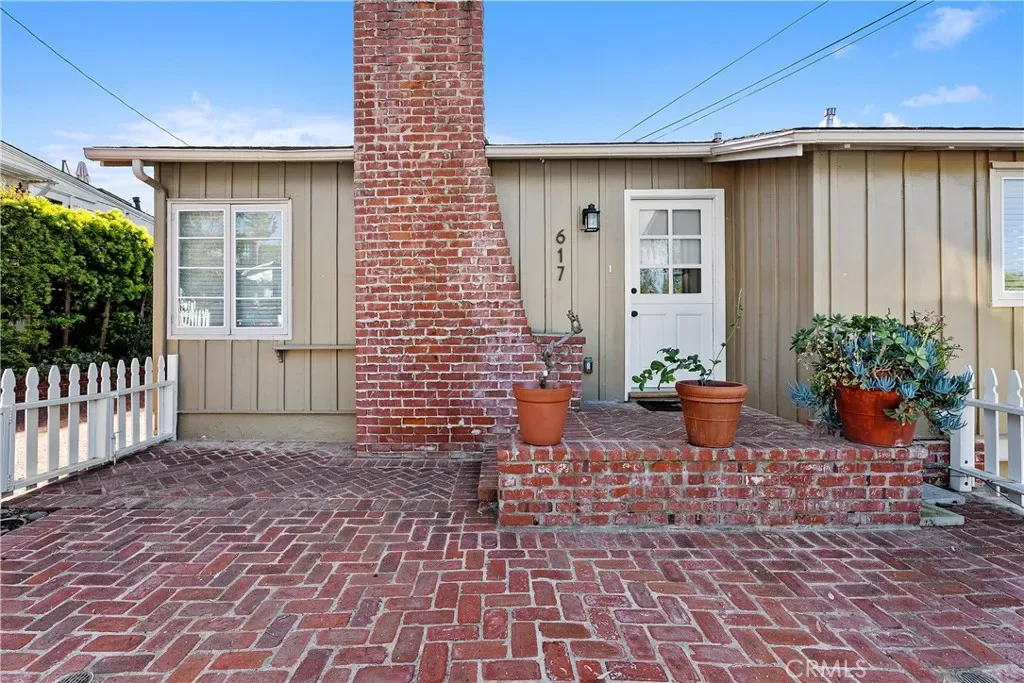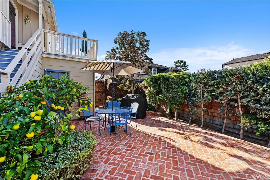 Curb Appeal: Exquisite brickwork walkways lead to a private front patio, offering the quintessential coastal cottage aesthetic.