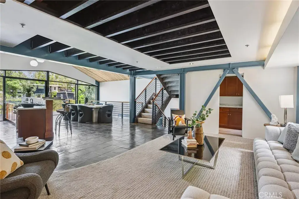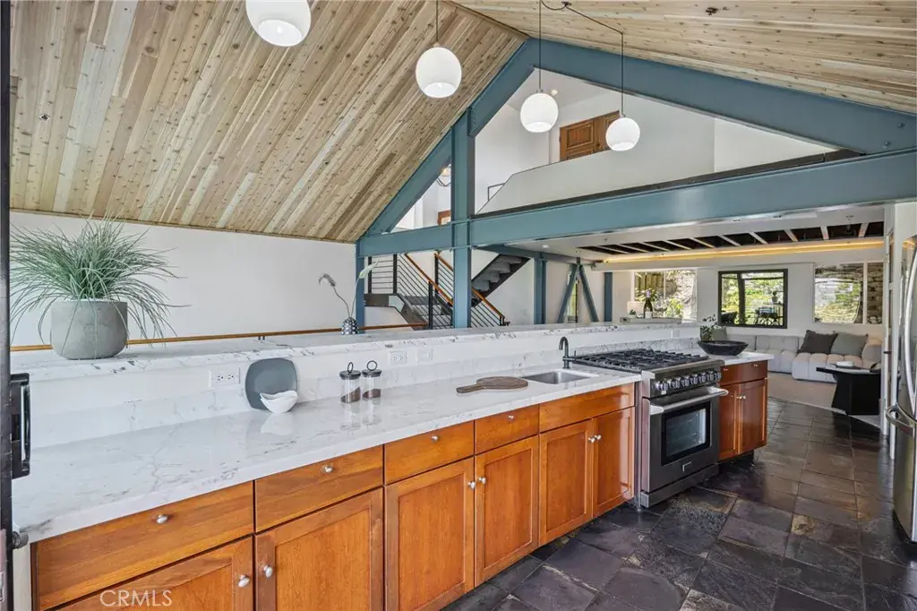 Set against a lush canyon backdrop, the home captures views of Catalina Island and coastal sunsets. The light-filled open floor plan includes three bedrooms, two and one-half bathrooms, a spacious great room encompassing the living, kitchen, and dining areas, as well as a separate family room suitable for a variety of uses. Architectural details showcase a refined industrial design with commercial-grade finishes balanced by warm, inviting interior spaces.