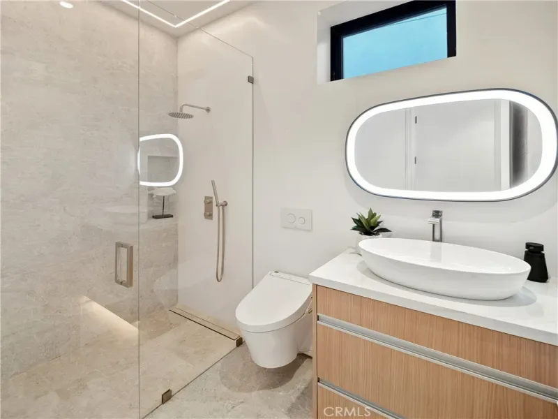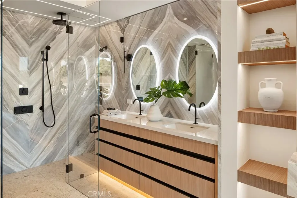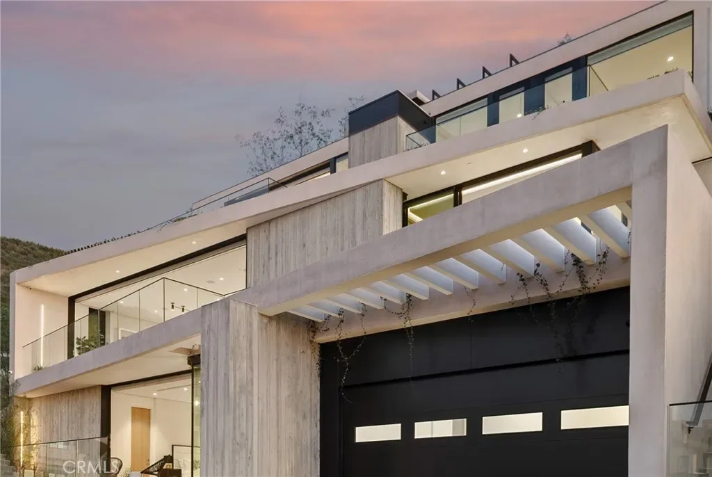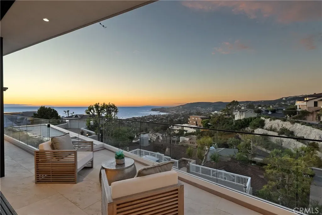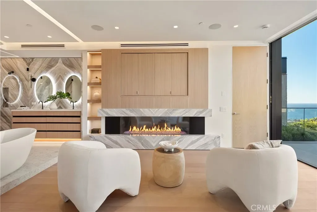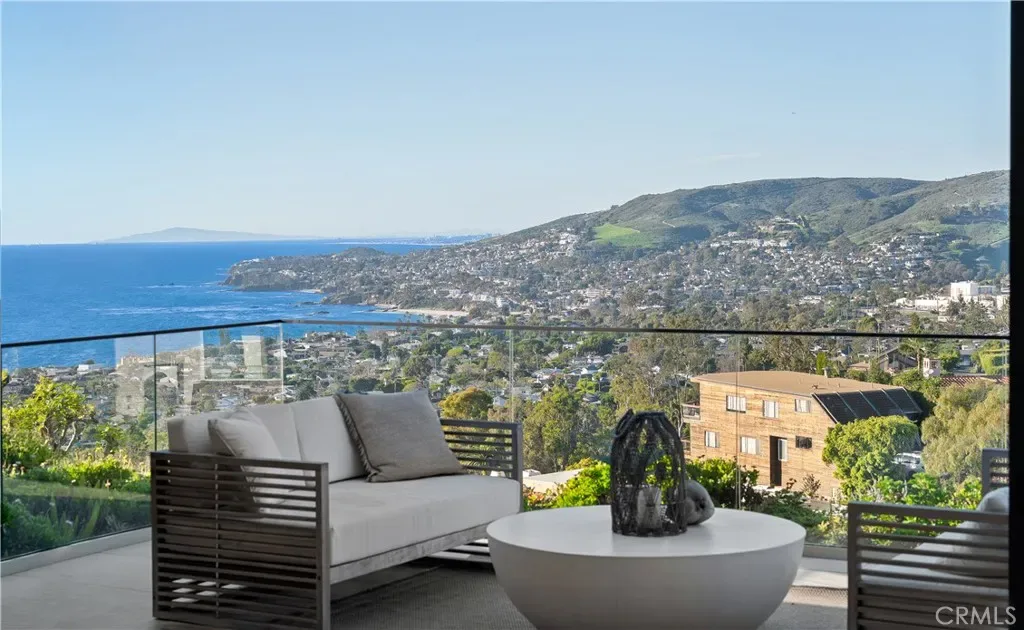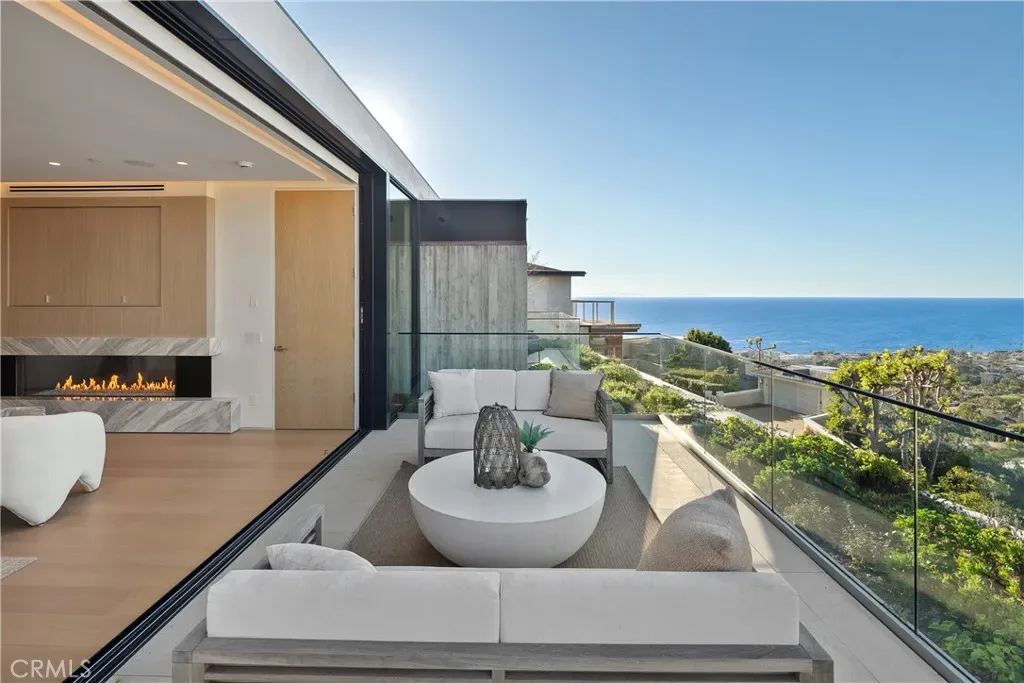 This newly constructed residence delivers a modern living experience defined by sweeping ocean views across Laguna Beach, high-quality materials, strong architectural lines, and a seamless indoor-outdoor flow. Thoughtfully positioned to capture western light and coastline panoramas, the layout is efficiently designed with no wasted space and is served by an elevator connecting all floors. The main living areas are positioned to allow for effortless flow to expansive outdoor terraces through large Western pocket doors, each framed by raised green planters that add texture and a natural counterpoint to the home’s clean architectural lines. Living, kitchen, dining, and bar spaces are open yet clearly defined, finished with limestone flooring, custom Italian cabinetry, and integrated lighting throughout. The kitchen is equipped with a full Thermador appliance package including dual dishwashers, integrated refrigerator and freezer, wine storage, built-in coffee system, steam microwave, and a full pantry. Italian marble countertops are used throughout the kitchen, bar, powder room, and fireplaces, while secondary bathrooms feature Spanish porcelain and full-height imported wall finishes. The upper level includes a primary suite and two additional ensuite bedrooms. The primary suite features motorized shades, a linear gas fireplace, custom walk-in closet, and a bathroom finished in Italian marble slab. A guest suite with walk-in closet and full bath is located near the main entry level, offering privacy and flexibility. Construction is predominantly steel and reinforced concrete, including twelve-inch exterior concrete walls, a concrete podium spanning the first level, and a foundation supported by more than forty-eight deep caissons. The garage offers 16-foot ceilings with capacity for vehicle lifts. Approved ADA-compliant plans for an additional dwelling unit are included, allowing for approximately 848 square feet of additional living space.