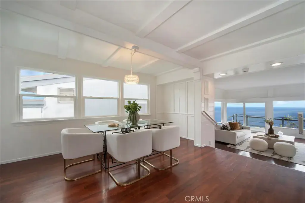 From breathtaking, 180-degree whitewater, coastline and Catalina Island views to its Cape Cod-inspired architecture, this versatile and spacious home captures the timeless charm of Laguna Beach. Just one row from the sand, the blufftop residence showcases panoramic vistas that span the coastline and beyond. Built in 1941, it offers exceptional privacy from the street, reserving the full impact of its jaw-dropping ocean setting for residents and guests. Expansive, unobstructed ocean views greet you immediately upon entry, with a light-filled main level that flows seamlessly from the dining room to a generous fireplace-warmed great room wrapped in vast windows. Breaking waves, glittering evening lights, Catalina Island, vivid sunsets, coastal hills, and Laguna’s iconic shoreline all compete for your attention, creating a constantly shifting canvas of natural beauty. These sweeping views extend through both levels of the home, as well as a large deck ideal for entertaining. A powder room is also featured on this floor, and a fully appointed kitchen displays white cabinetry, Silestone quartz countertops, stainless steel appliances, an imported Blanco sink, and direct access to an attached two-car garage. Wood flooring enriches the main level, while abundant built-in cabinetry and storage are enjoyed throughout. Custom craftsmanship is evident in the beamed ceilings, wainscoting, shiplap, white wall panels, and crown molding. The lower level hosts three bedrooms and two baths, including an en suite with bonus space perfect for a studio, office, or creative retreat. Two additional bedrooms boast stunning ocean views, with one offering a wood-burning fireplace with gas starters. A secondary entrance and access to an ocean-view patio further enhance the home’s versatility. Enjoy a prime location moments from Victoria Beach and its iconic pirate’s tower, Aliso Beach, and Laguna’s Main Beach and village. Nestled in a peaceful setting, this coastal retreat—once home to world-renowned philosopher Jacques Derrida—offers effortless access to sun, surf, and sand. Luxurious resorts, top-rated schools, and scenic trails are all just minutes away, making this a rare opportunity to own a piece of Laguna’s rich history and a front-row seat to the coast’s most spectacular views.