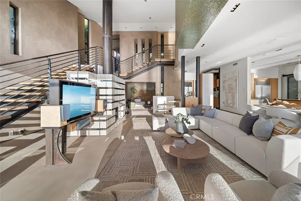 Beyond a private entry, a sculptural floating staircase leads to a dramatic double-height great room wrapped in walls of glass looking out to the sea. A statement fireplace anchors the space, with generous sitting and dining areas, a wet bar and a beautifully appointed chef’s kitchen with premium finishes. Special features include an oversized island which creates an effortless environment for entertaining. Sunlight fills the interiors, which open seamlessly to both a courtyard patio and an expansive ocean-view terrace. A versatile bedroom, currently styled as an office, completes this main level.