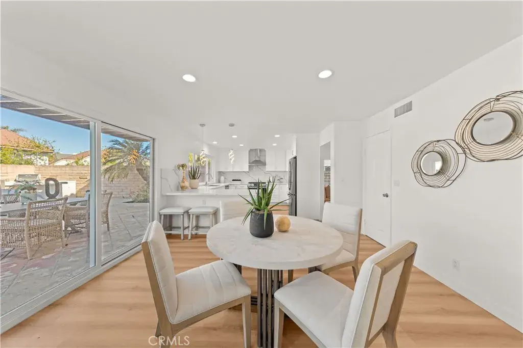 The formal dining room is highlighted by luxury wood-textured flooring, large sliding windows, and elegant pendant lighting. The gourmet kitchen is a chef’s dream, featuring new stainless-steel appliances, white shaker cabinets with solid wood drawers, marble-style quartz countertops and backsplash, and sleek new hardware.