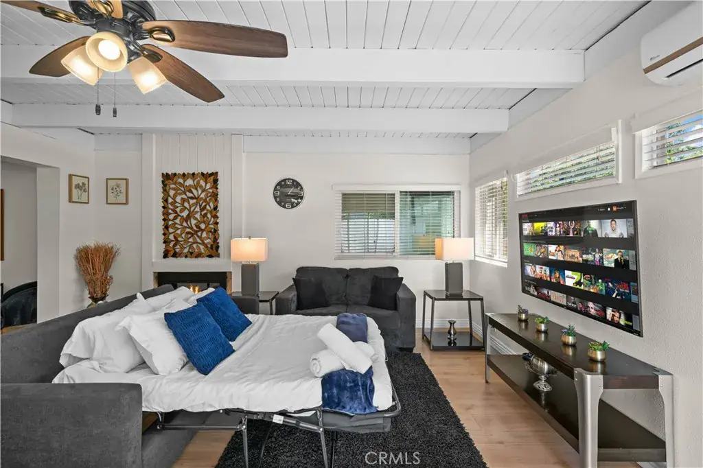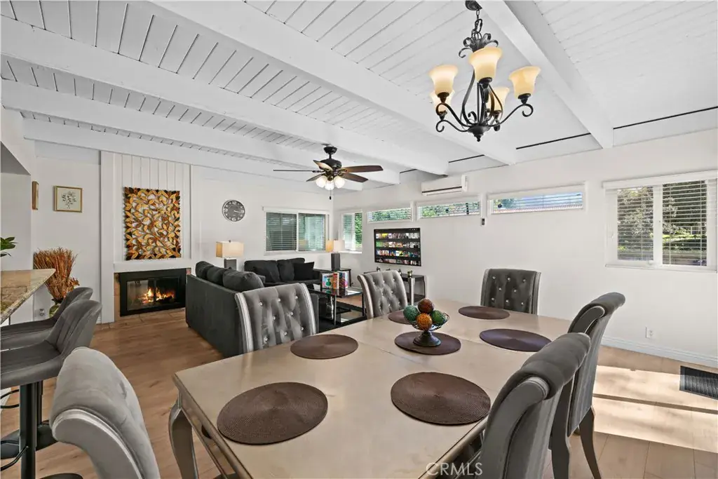 Inside, enjoy a bright open floor plan with upgraded flooring, dual-pane windows, a fireplace, and abundant natural light. The fully renovated kitchen features custom solid-wood cabinetry, granite counters, and premium stainless-steel appliances, creating a space that’s perfect for everyday cooking or elevated entertaining. The spacious dining and living area flows seamlessly and includes a luxury fireplace and smooth-finish walls for a clean, modern aesthetic.