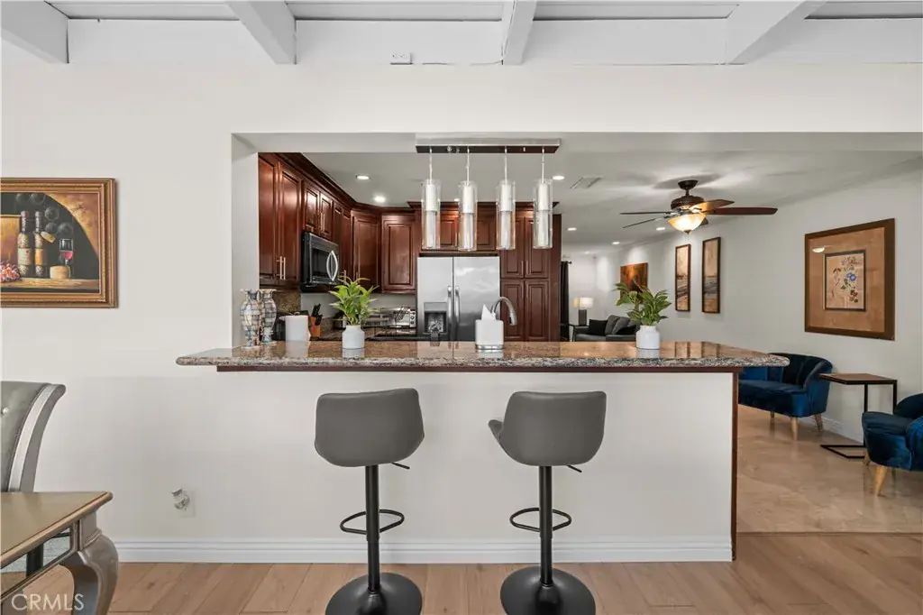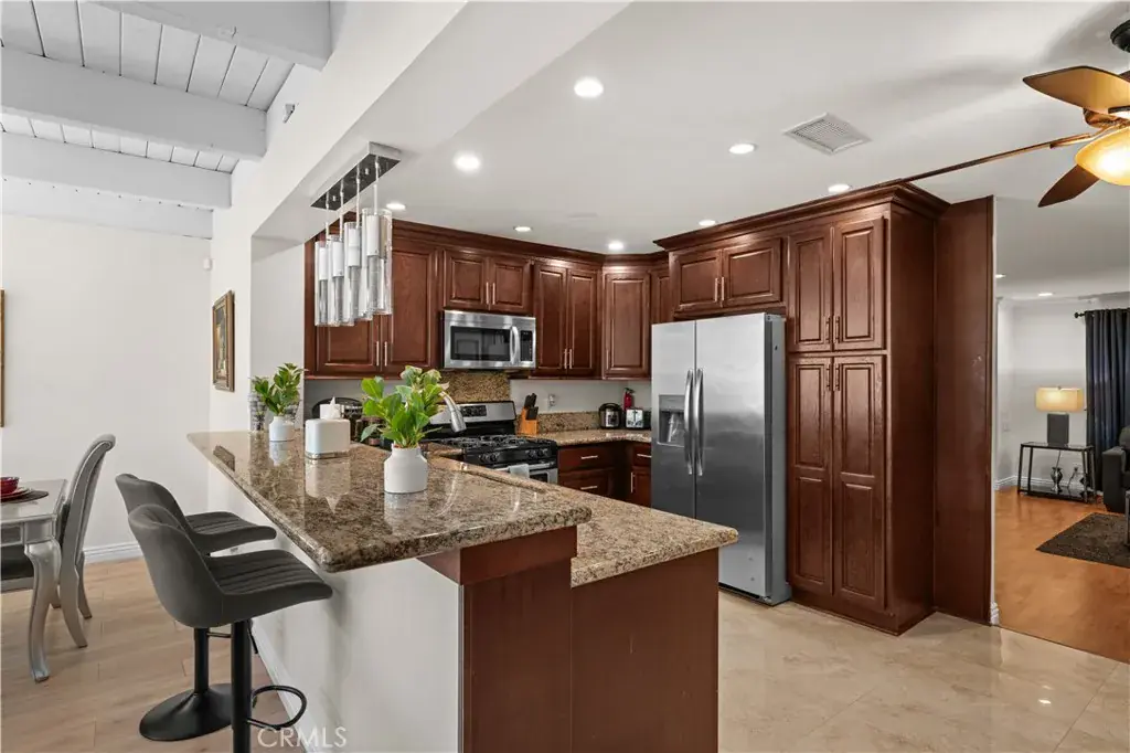Inside, enjoy a bright open floor plan with upgraded flooring, dual-pane windows, a fireplace, and abundant natural light. The fully renovated kitchen features custom solid-wood cabinetry, granite counters, and premium stainless-steel appliances, creating a space that’s perfect for everyday cooking or elevated entertaining. The spacious dining and family room includes a luxury fireplace and smooth-finish walls for a clean, modern aesthetic. A separate living area with bright recess lights which flows seamlessly into the rest of the beautiful home.