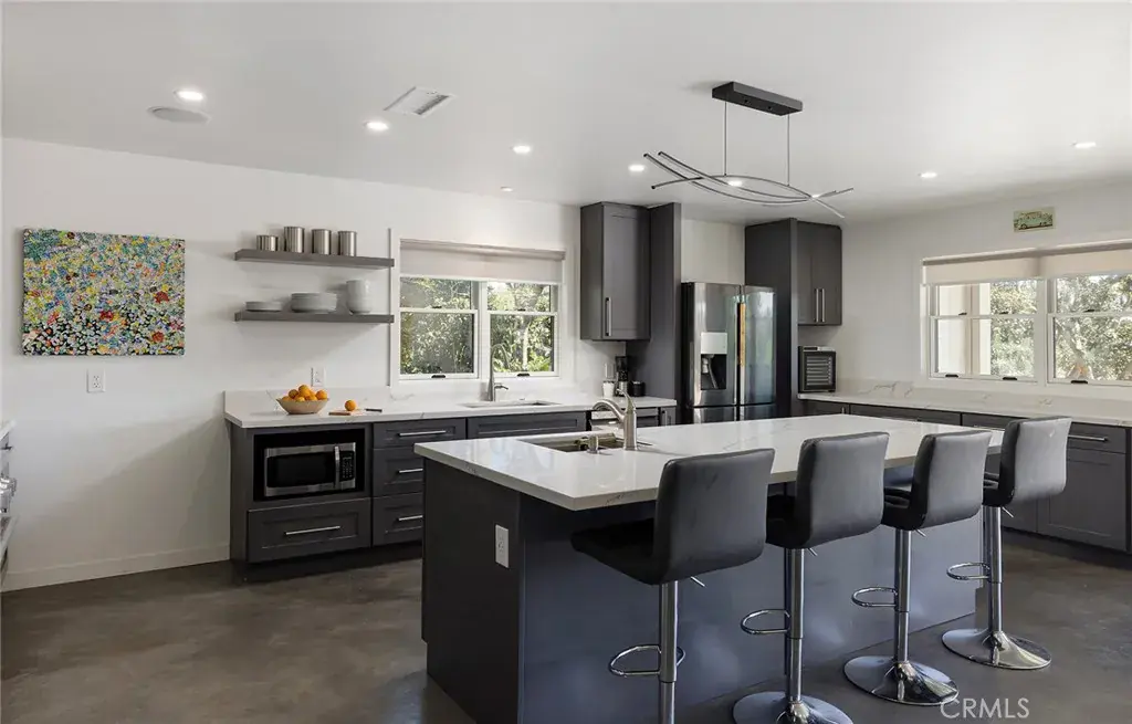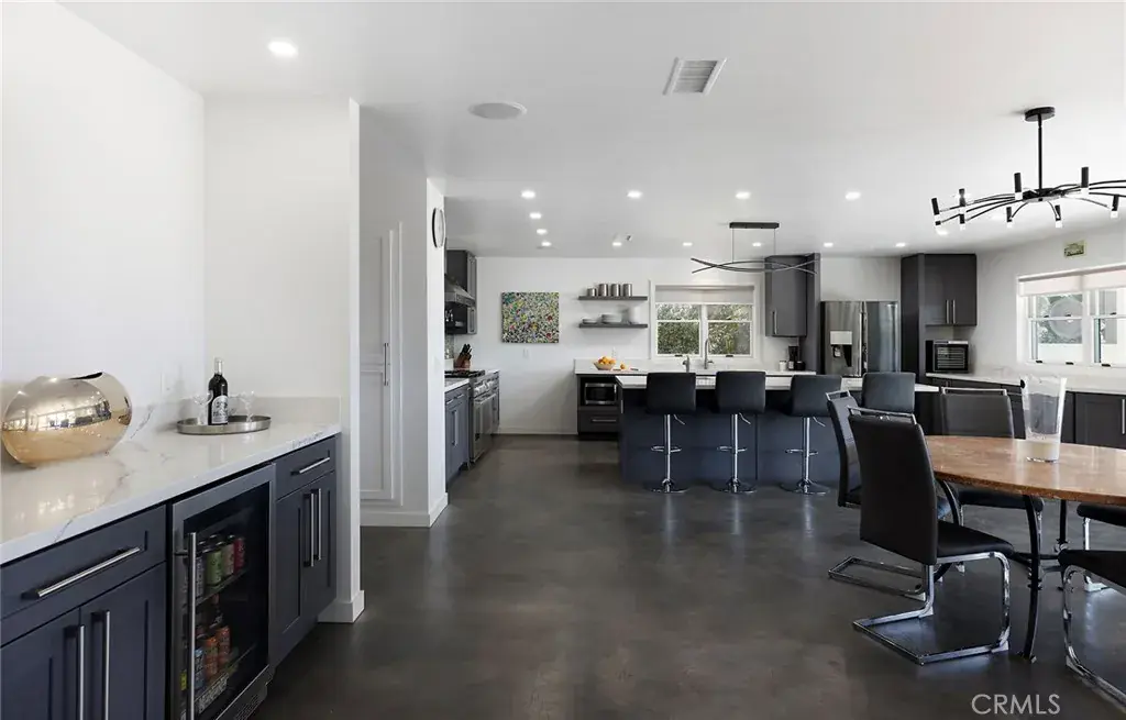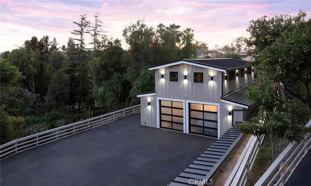 Rebuilt in 2024, this modern-luxury home in prestigious Nellie Gail Ranch offers the ultimate equestrian lifestyle, complete with direct access to horse trails and an impressive 1,700-square-foot converted barn with an upstairs apartment. Situated on nearly an acre, this sophisticated residence combines contemporary elegance with unparalleled outdoor amenities. The 4,100-square-foot, single-level main house showcases chic design with polished concrete floors, stylish light fixtures, 9-foot ceilings, and abundant natural light flowing through the grand two-story entryway. The open-concept kitchen features quartz countertops, Shaker cabinetry, and a large island with a built-in dog feeding station, while bifold doors seamlessly connect to the patio for indoor-outdoor living. A dry bar with beverage refrigerator and matching island adds to the home’s entertaining capabilities. Six bedrooms provide exceptional flexibility, with the primary suite offering a bonus office retreat, built-in cabinetry, and a spa-like bathroom with an upstairs dressing space spanning the full attic. Multiple bedrooms also open directly to exterior spaces for private outdoor access. Updated modern systems include zoned HVAC with two condensers plus two upstairs heat pumps, tankless water heating, PEX piping, water softener, smart lighting, and Sonos sound throughout. The property’s standout feature is the remarkable barn with a fully renovated 600-square-foot apartment above, complete with a separate entrance, plus an office, craft room, workshop, and storage below. The equestrian-zoned lot provides direct trail access and includes thoughtful amenities like RV parking, a dog run, chicken coop, and storage sheds. Mature landscaping with 30 fruit trees and Cyprus privacy screening frames the generous patio where stunning southwestern sunset views unfold over rolling hills. The property is even pre-plumbed for pool and spa installation. Nellie Gail Ranch offers exceptional value with low monthly HOA fees covering security, over 25 miles of riding trails, and membership to the swim, tennis and pickleball club, plus access to ‘The Watering Hole’ restaurant and exclusive community events. This one-of-a-kind property is truly a must-see!