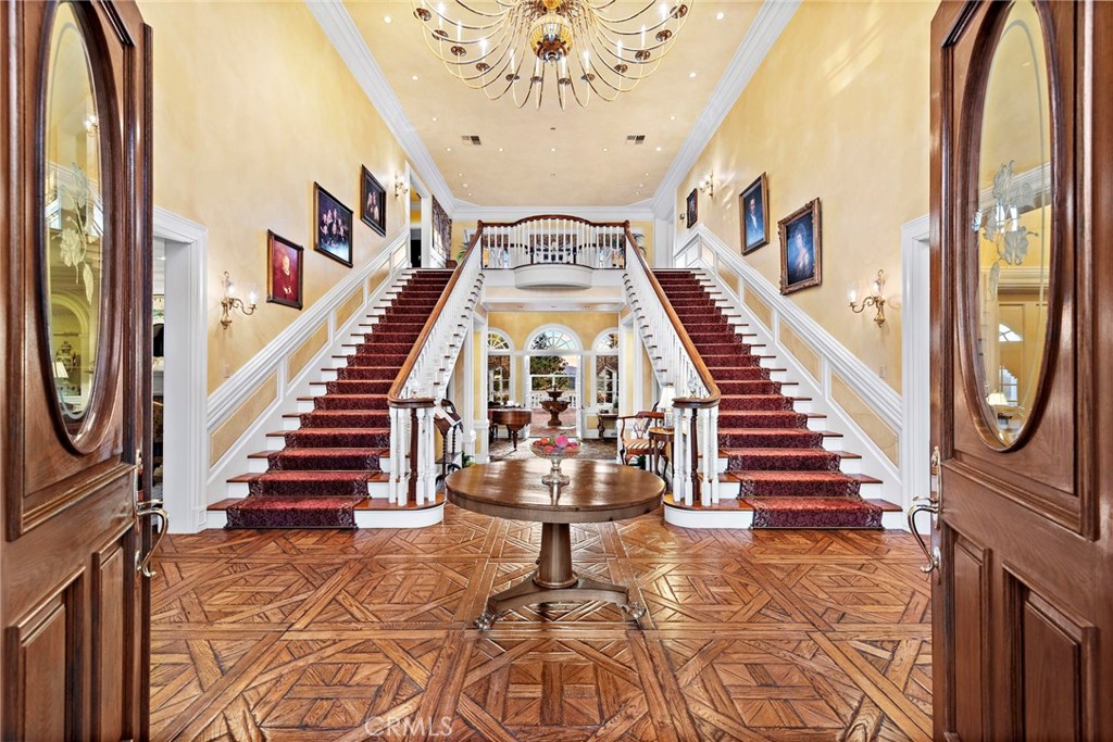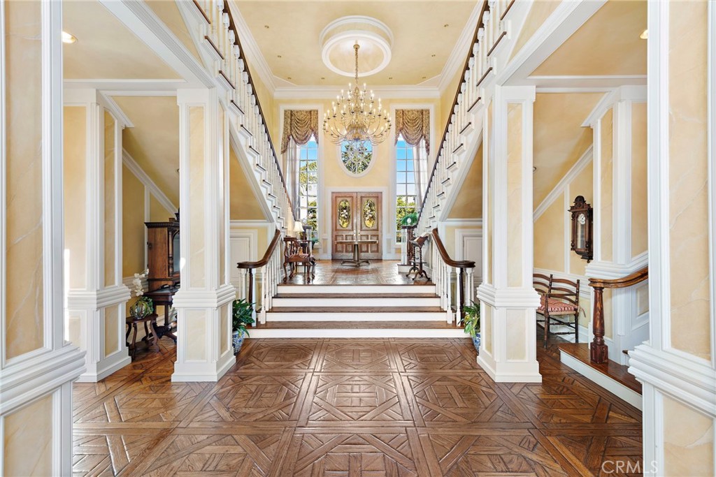 A grand dual staircase welcomes you into a spacious, open interior. Custom hardwood parquet floors flow throughout, complemented by expansive windows that fill the rooms with natural light and capture the breathtaking views. Soaring ceilings, crown molding, and refined finishes throughout further elevate the space.