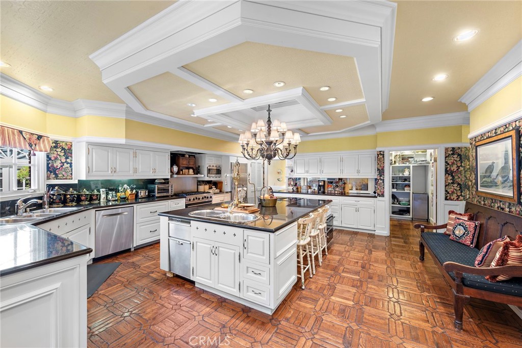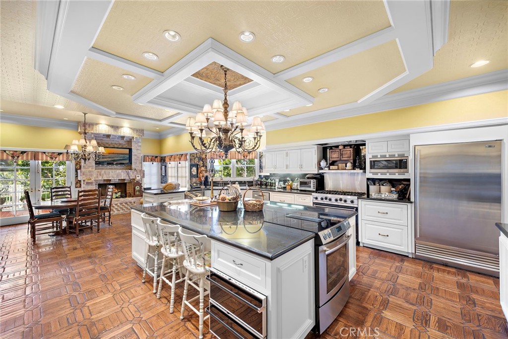 The gourmet kitchen is a chef’s dream, featuring a large central island, Viking stove, and Sub-Zero appliances, including dual refrigerator and freezer drawers. A mirrored butler’s pantry blends style and practicality.
