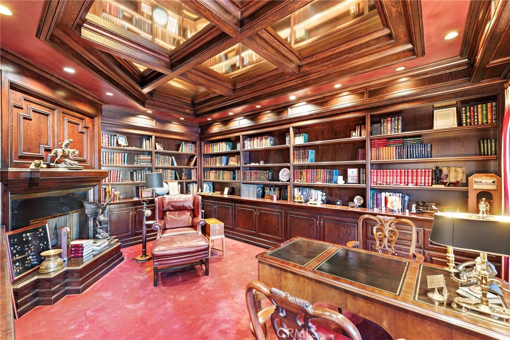 Coffered ceilings grace the billiard room, family room, and office, creating peaceful spaces for work or relaxation. The family room, with a cozy fireplace, built-in cabinetry, wet bar, and bath, is perfect for both casual and formal gatherings.