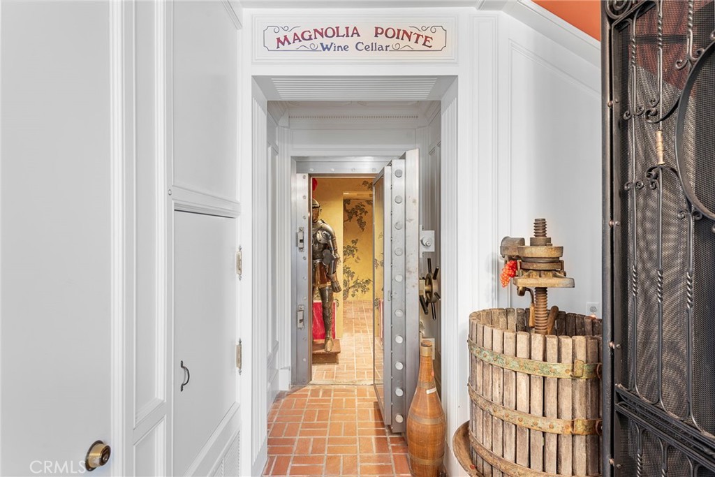 For wine enthusiasts, a vintage vault door leads to a wine cellar, ideal for tastings or quiet enjoyment. A charming birdcage elevator adds a touch of elegance and convenience.