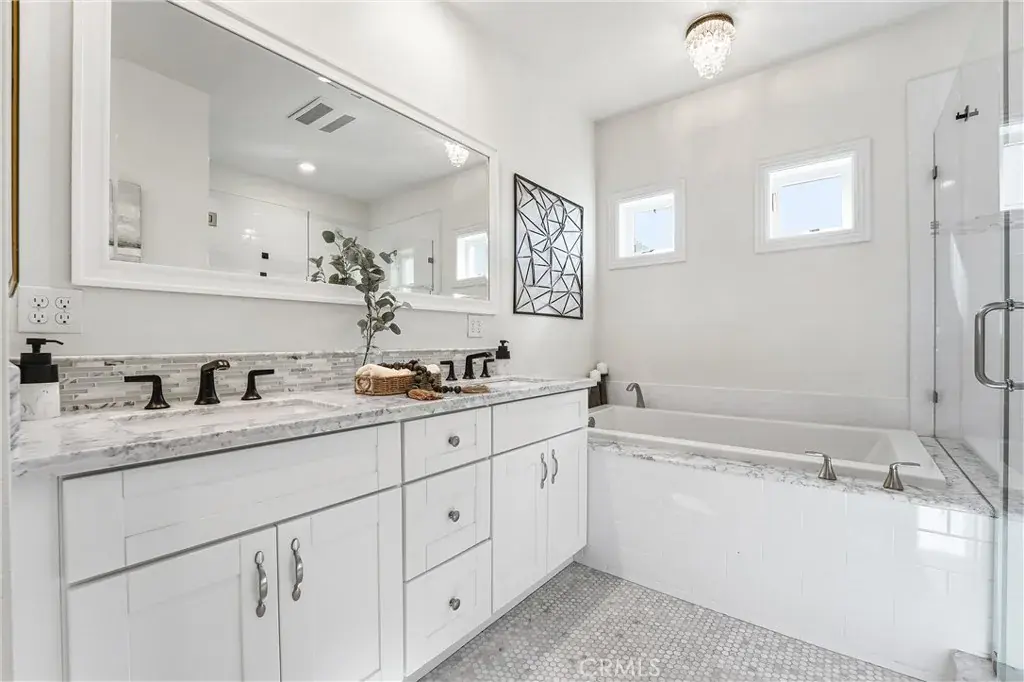 Upstairs presents an impressive primary suite featuring dual walk-in closets and a beautifully remodeled spa-inspired bathroom as well as an additional room that can be used as an office or homework space. Outdoors, enjoy your own secluded oasis with a spa, fire pit, and mature fruit trees—ideal for relaxing evenings or intimate gatherings, all surrounded by exceptional privacy.