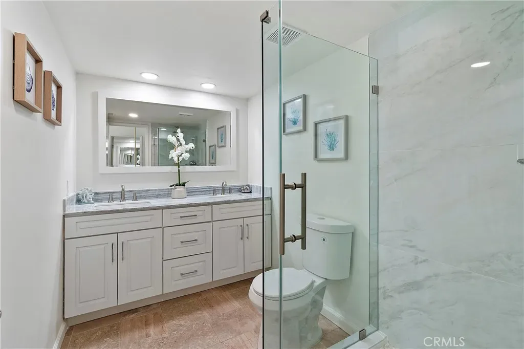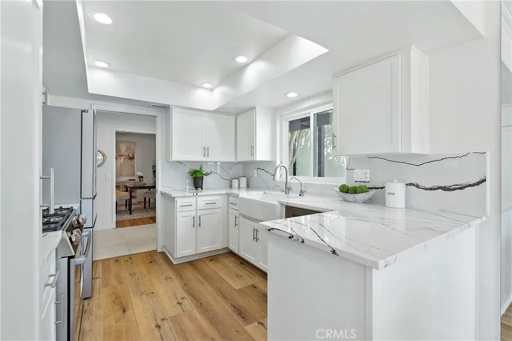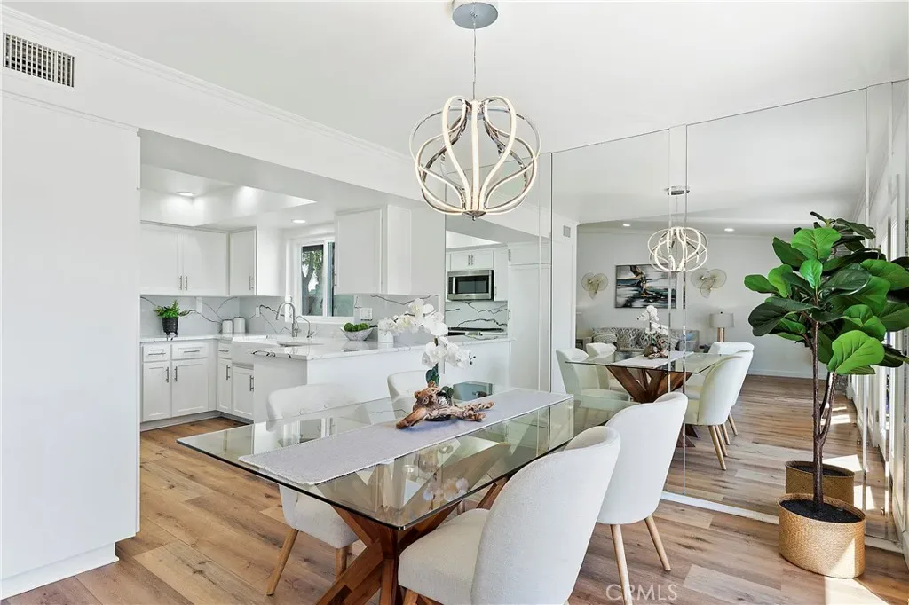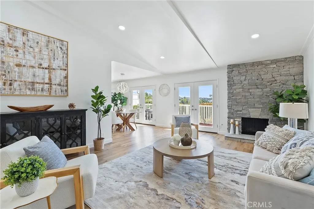 Welcome to this beautifully renovated, single-level townhome in the highly desirable El Niguel Terrace community of Laguna Niguel. Offering 4 bedrooms and 2.5 bathrooms, this move-in ready residence showcases a bright, open-concept layout paired with modern, thoughtfully curated finishes throughout. The heart of the home is a stunning, chef-inspired kitchen featuring quartz countertops, Bosch appliances, a farmhouse sink, gas range, built-in microwave, soft-close cabinetry, and generous pantry storage—perfect for both everyday living and effortless entertaining. It has a breakfast bar and opens to the dining area. The spacious living room is warm and inviting, complete with a cozy fireplace. Brand new French doors from both the dining area and the living room open to a private backyard, creating a seamless indoor-outdoor flow ideal for dining, relaxing, or enjoying the coastal sunshine. The primary suite serves as a peaceful retreat featuring wall-to wall closets with mirrored doors. There are 3 additional bedrooms and 2 bathrooms. The fully renovated primary bathroom offers a 2-sink vanity and a custom designed shower stall.