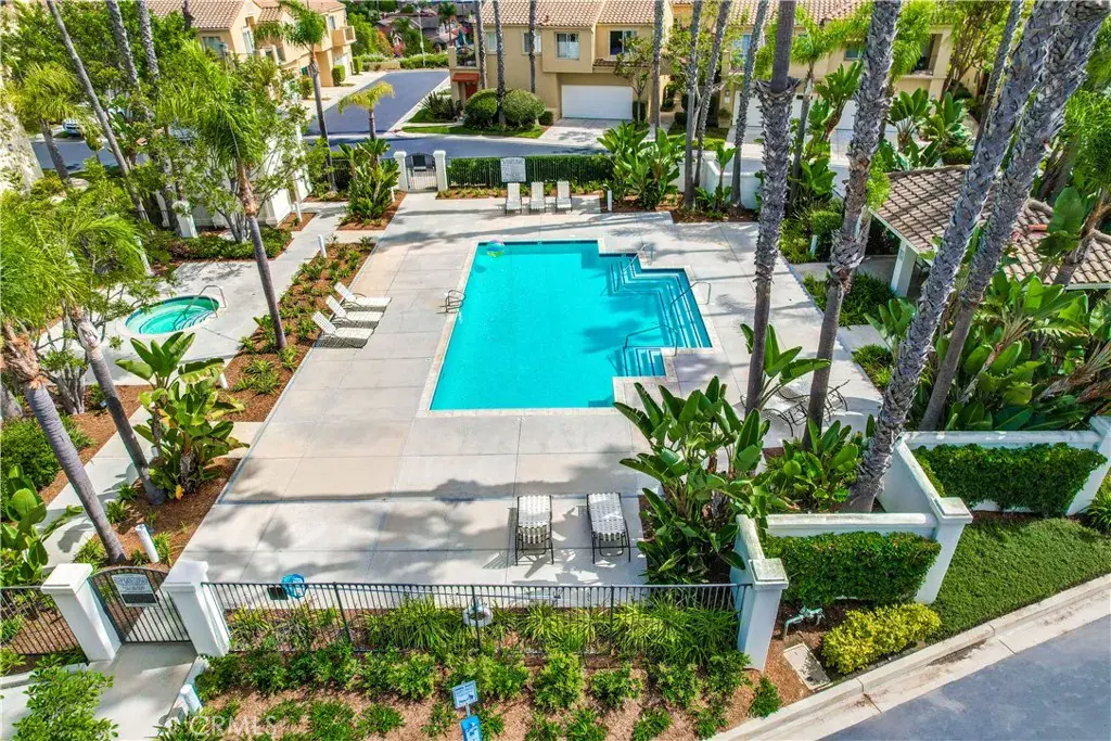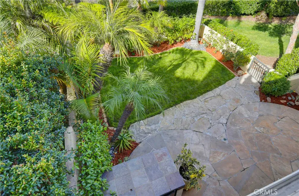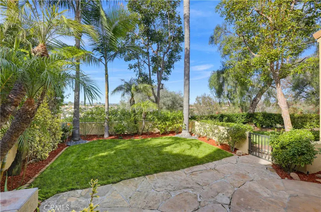 Beautifully updated end-unit home ideally situated on a lush greenbelt with sweeping sunset and rolling hill views. Set on one of the largest and most desirable lots in the Encore at Marina Hills community, this light-filled residence offers privacy, space, and an exceptional backyard oasis. An arched walkway and gated front courtyard welcome you inside to gorgeous hardwood floors throughout and crown molding. The open floor plan features a spacious living area with sit-down views and a stunning three-sided gas fireplace shared with the dining area. Two sets of sliding glass doors create seamless indoor-outdoor living. The kitchen boasts rich hardwood cabinetry, granite countertops, glass tile backsplash, recessed lighting, and stainless-steel appliances, opening perfectly to the dining area for easy entertaining. The main level includes a powder room and a laundry room. Upstairs, the freshly painted primary suite features vaulted ceilings, dual vanities, a shower/tub enclosure with bench, and a large private balcony ideal for enjoying sunsets and ocean breezes. The freshly painted secondary bedroom offers vaulted ceilings, updated dual-pane windows, and beautiful views. The expansive backyard is perched above a peaceful greenbelt and showcases a sandstone patio, built-in BBQ and bar, grassy lawn, vibrant rose bushes, and lush tropical landscaping with mature trees—perfect for relaxing or entertaining. Additional highlights include a direct-access two-car garage with built-in storage, refrigerator, washer, and dryer included, and HOA coverage for water. Encore amenities include a pool and spa, picnic areas, and close proximity to parks, trails, shopping, dining, beaches, and easy freeway and toll road access. Tenants to enjoy resort like Marina Hills Park amenities as well, including pool, clubhouse, tennis courts, playgrounds, sport courts and playing fields.