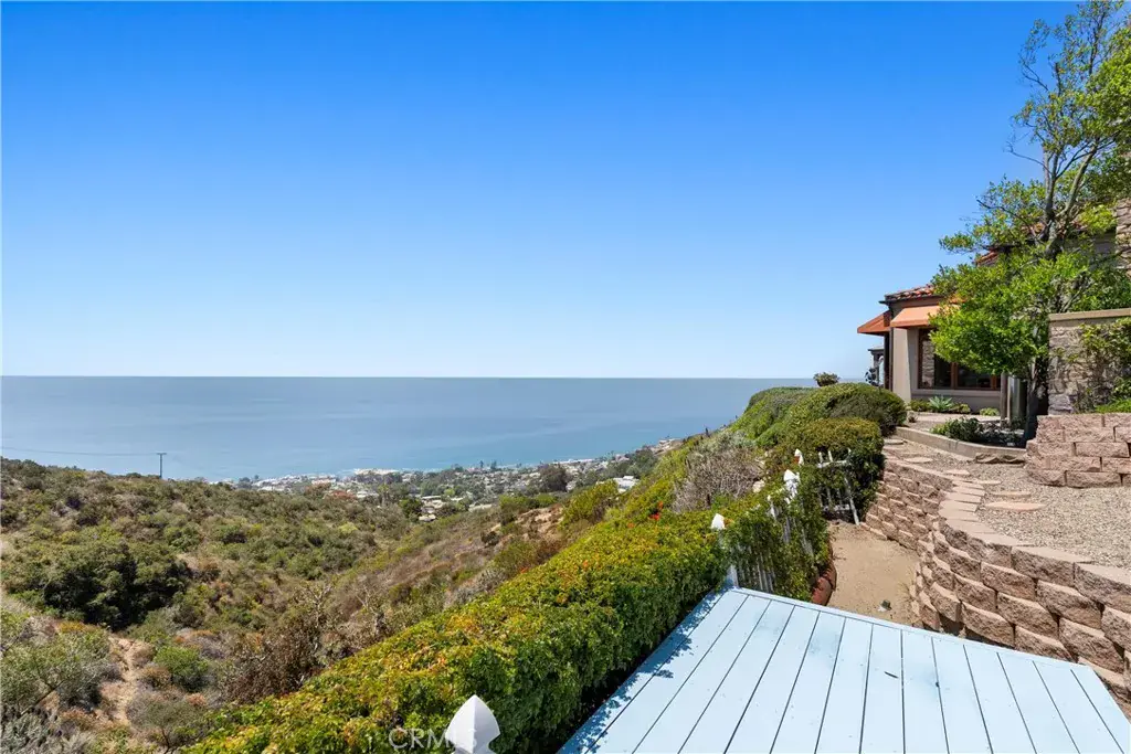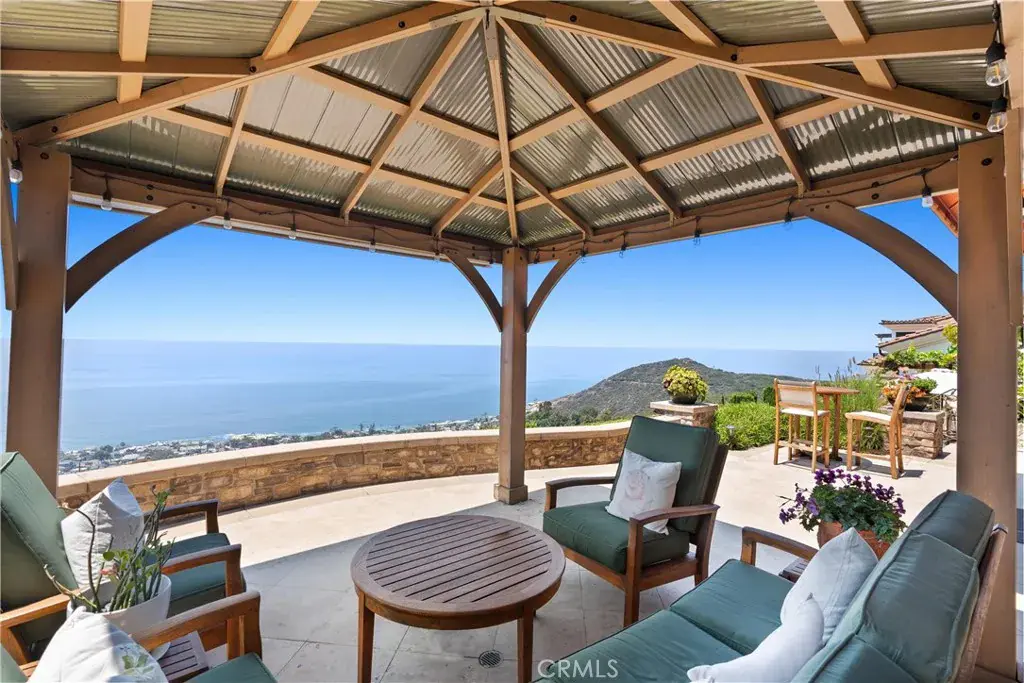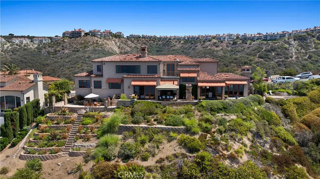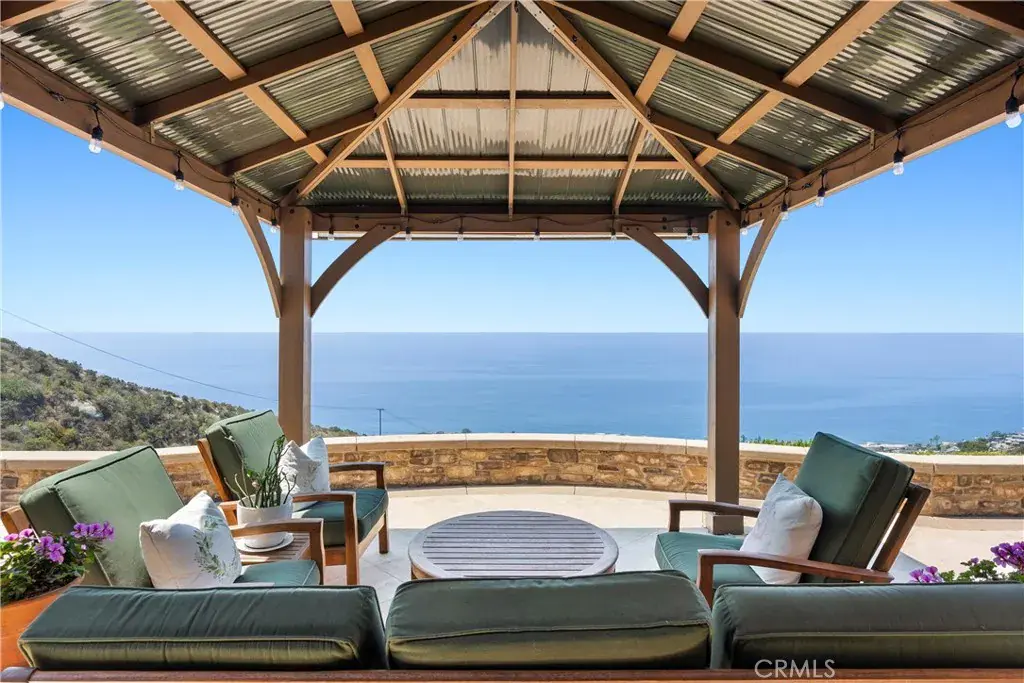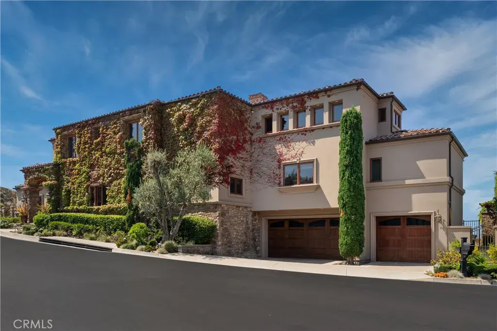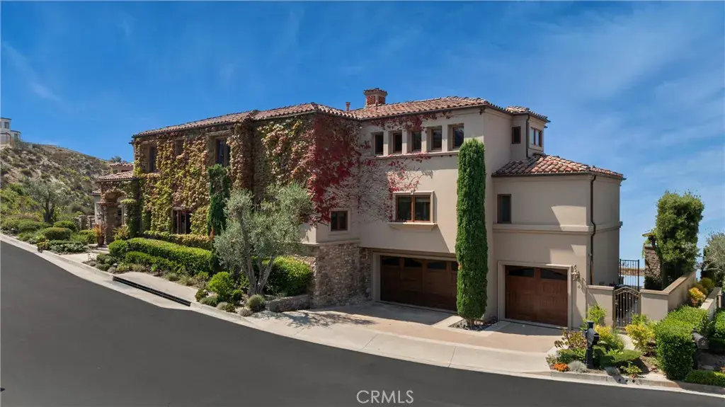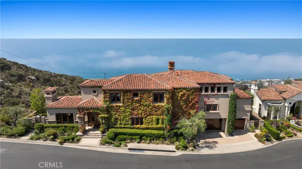 Nestled within a prestigious guard-gated community, this Mediterranean custom estate is perched on a scenic bluff, capturing sweeping, unobstructed views of the ocean, Catalina Island, and coastline from nearly every room. Thoughtfully designed with four bedrooms and a dedicated office, the residence features a sought-after main-level primary suite and ensuite baths in each bedroom, offering elevated comfort and privacy. Defined by timeless craftsmanship, the interiors blend rustic elegance with refined detail—highlighted by custom distressed wood beams, rich hardwoods, stone accents, and bespoke lighting throughout. French doors open to expansive viewing decks, creating a seamless connection to the coastal surroundings and inviting in ocean breezes. Tailored for both intimate gatherings and grand entertaining, the home offers a formal living room with stone fireplace, a sophisticated dining room, and a spacious great room that flows effortlessly into the chef’s kitchen. Culinary enthusiasts will appreciate the Thermador gas range with grill, double ovens, dual warming drawers, Sub-Zero refrigerator, and additional refrigerated drawers. A walk-in pantry, butler’s pantry, wet bar, and temperature-controlled wine room complete the entertainer’s experience. The outdoor living area offers a serene escape, enhanced by lush landscaping, a tranquil water feature, and a striking fireplace. This private retreat features the perfect backdrop for relaxed coastal living beneath the stars. All just moments from the renowned beaches, art galleries, and fine dining of Laguna Beach.