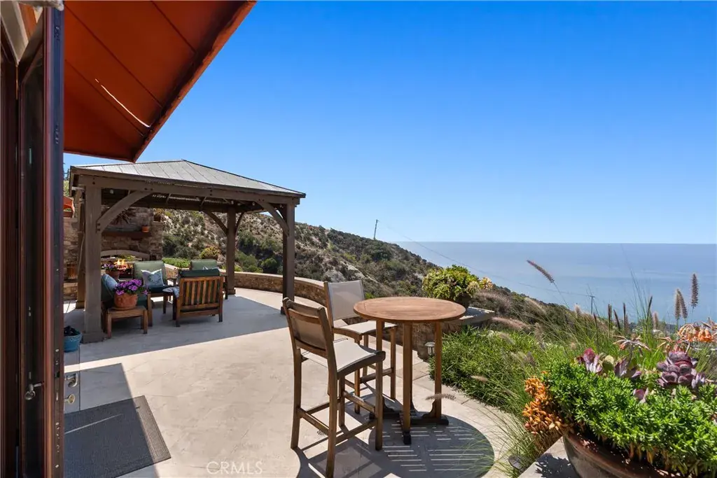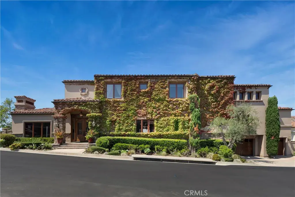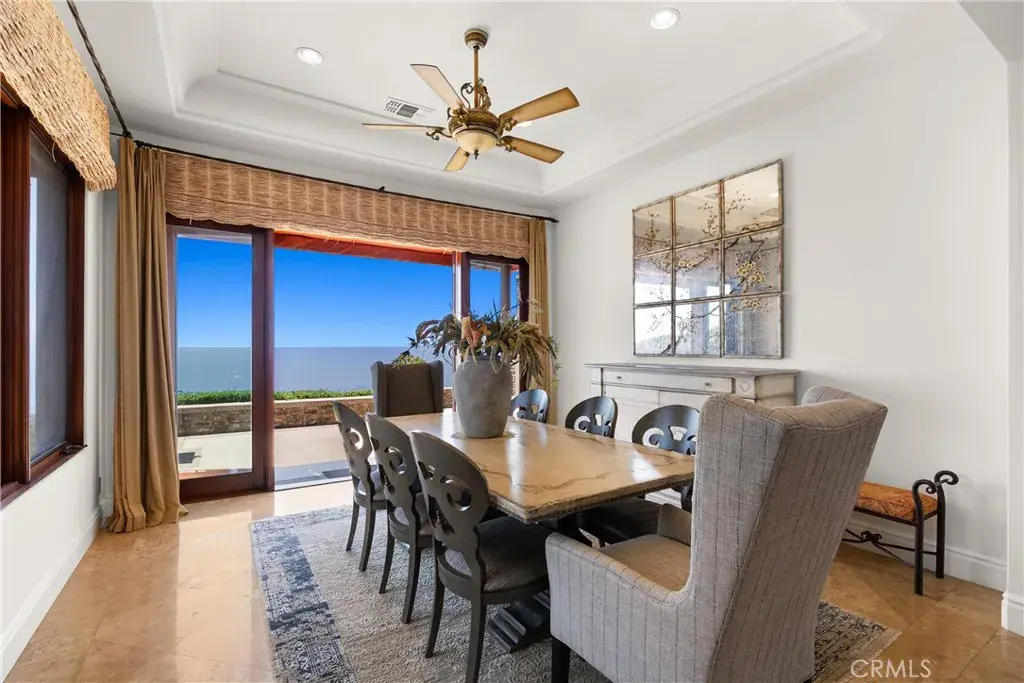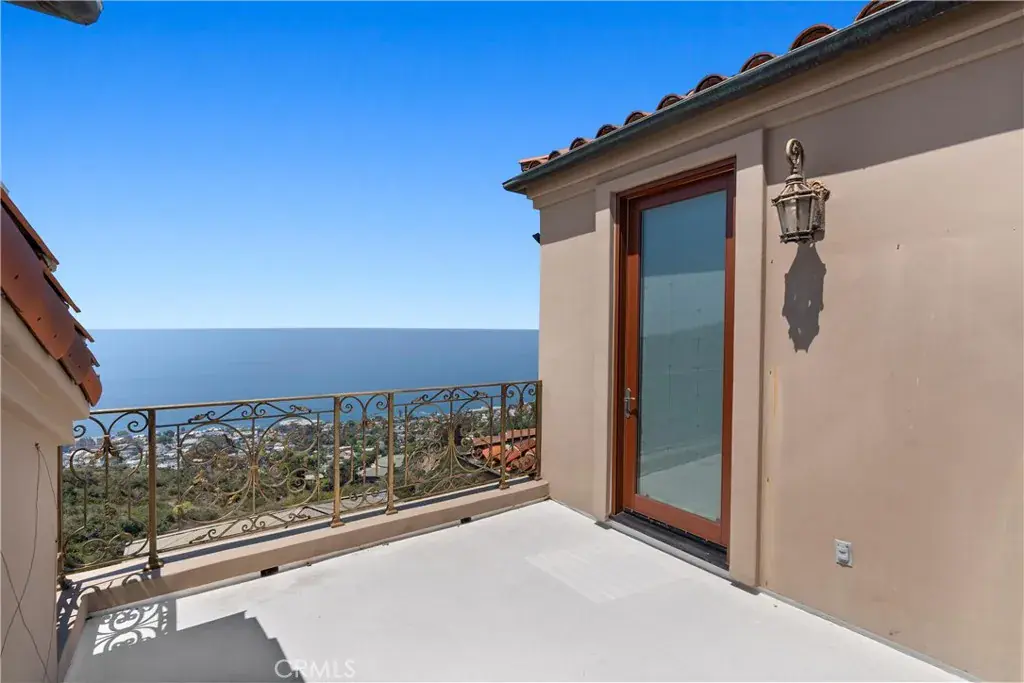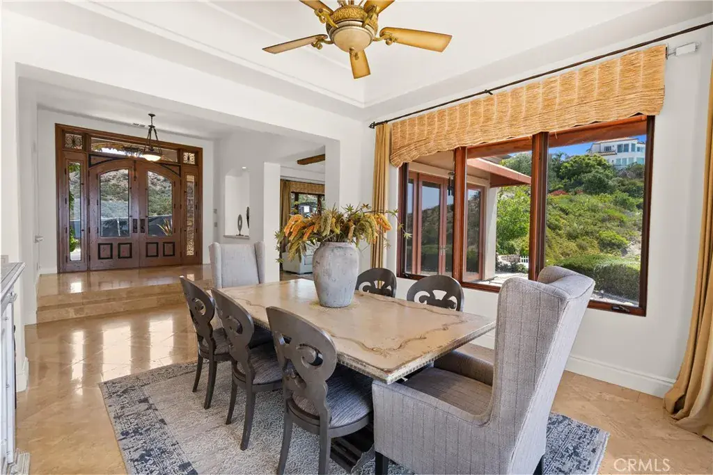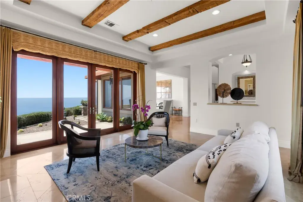 Nestled within a prestigious guard-gated community, this Mediterranean custom estate is perched on a scenic bluff, capturing sweeping, unobstructed views of the ocean, Catalina Island, and coastline from nearly every room. Thoughtfully designed with four bedrooms and a dedicated office, the residence features a sought-after main-level primary suite and ensuite baths in each bedroom, offering elevated comfort and privacy. Defined by timeless craftsmanship, the interiors blend rustic elegance with refined detail—highlighted by custom distressed wood beams, rich hardwoods, stone accents, and bespoke lighting throughout. French doors open to expansive viewing decks, creating a seamless connection to the coastal surroundings and inviting in ocean breezes. Tailored for both intimate gatherings and grand entertaining, the home offers a formal living room with stone fireplace, a sophisticated dining room, and a spacious great room that flows effortlessly into the chef’s kitchen. Culinary enthusiasts will appreciate the Thermador gas range with grill, double ovens, dual warming drawers, Sub-Zero refrigerator, and additional refrigerated drawers. A walk-in pantry, butler’s pantry, wet bar, and temperature-controlled wine room complete the entertainer’s experience. The outdoor living area offers a serene escape, enhanced by lush landscaping, a tranquil water feature, and a striking fireplace. This private retreat features the perfect backdrop for relaxed coastal living beneath the stars. All just moments from the renowned beaches, art galleries, and fine dining of Laguna Beach.