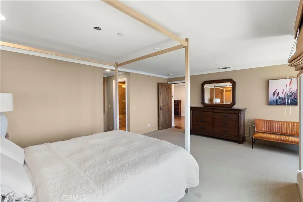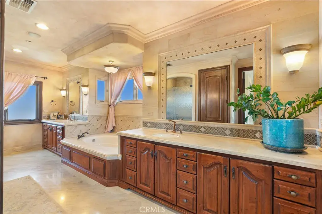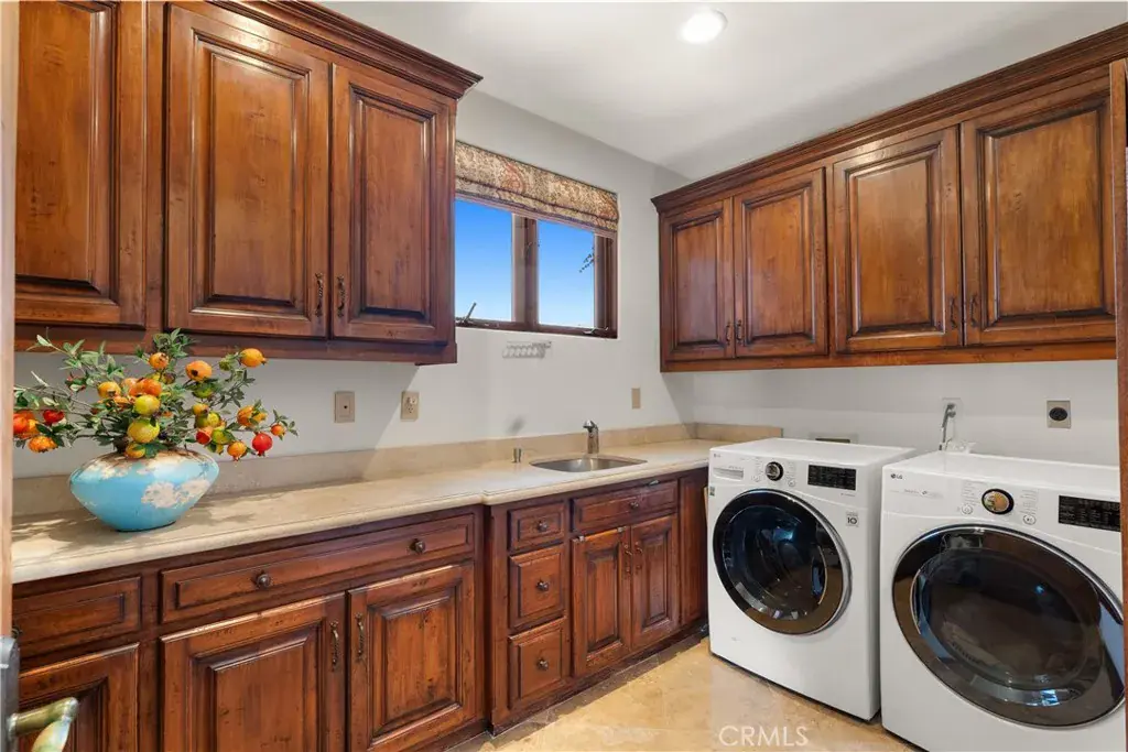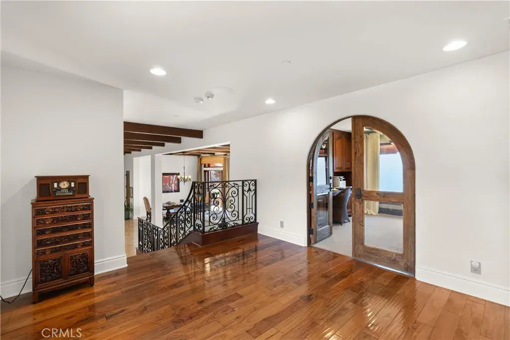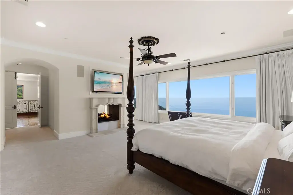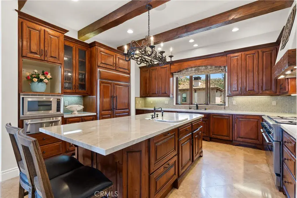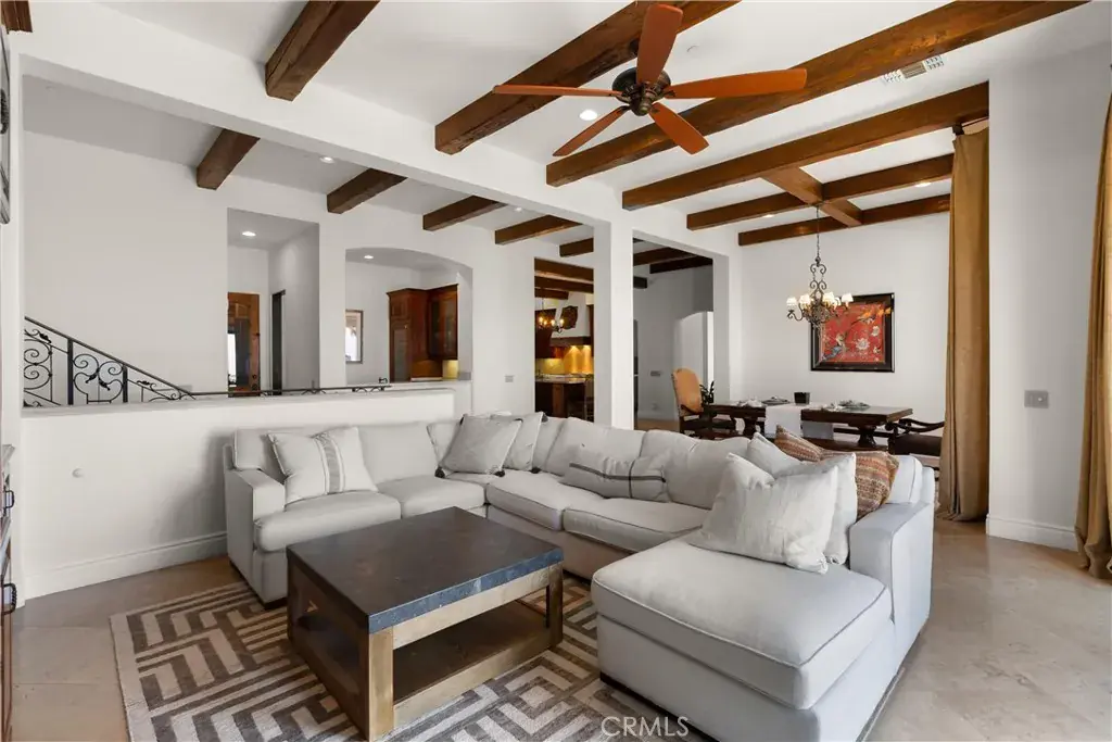Nestled within a prestigious guard-gated community, this Mediterranean custom estate is perched on a scenic bluff, capturing sweeping, unobstructed views of the ocean, Catalina Island, and coastline from nearly every room. Thoughtfully designed with four bedrooms and a dedicated office, the residence features a sought-after main-level primary suite and ensuite baths in each bedroom, offering elevated comfort and privacy. Defined by timeless craftsmanship, the interiors blend rustic elegance with refined detail—highlighted by custom distressed wood beams, rich hardwoods, stone accents, and bespoke lighting throughout. French doors open to expansive viewing decks, creating a seamless connection to the coastal surroundings and inviting in ocean breezes. Tailored for both intimate gatherings and grand entertaining, the home offers a formal living room with stone fireplace, a sophisticated dining room, and a spacious great room that flows effortlessly into the chef’s kitchen. Culinary enthusiasts will appreciate the Thermador gas range with grill, double ovens, dual warming drawers, Sub-Zero refrigerator, and additional refrigerated drawers. A walk-in pantry, butler’s pantry, wet bar, and temperature-controlled wine room complete the entertainer’s experience. The outdoor living area offers a serene escape, enhanced by lush landscaping, a tranquil water feature, and a striking fireplace. This private retreat features the perfect backdrop for relaxed coastal living beneath the stars. All just moments from the renowned beaches, art galleries, and fine dining of Laguna Beach.