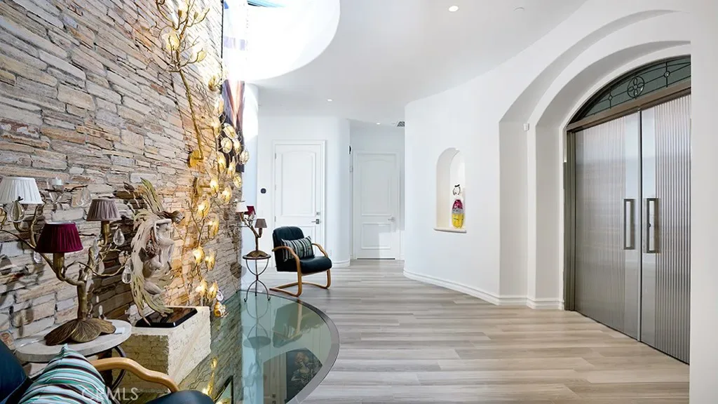 Dramatic 20-foot entry crowned by a custom Murano glass chandelier introduces interiors conceived as gallery space. Architectural finishes read as sculptural elements, with dedicated art walls and multiple niches intentionally integrated to showcase collections. Hand-painted ceiling frescoes by mural artist Donovan Fitzgerald add bespoke dimension and refinement throughout.