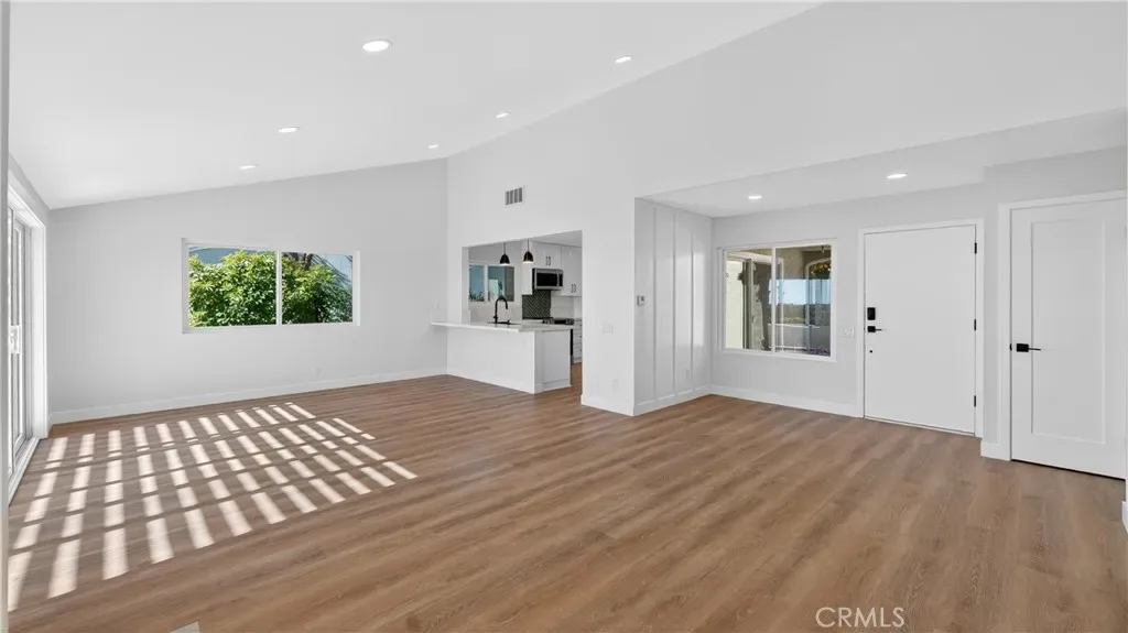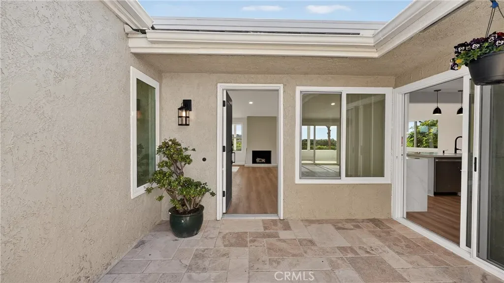 A gated front courtyard with elegant travertine flooring welcomes you home. Inside, ocean and hilltop views take center stage, highlighted by a 12-foot sliding glass door overlooking the lush rear patio. The living room features a custom lime-wash fireplace, designer panel accent wall, recessed lighting, and brand-new luxury vinyl flooring throughout.