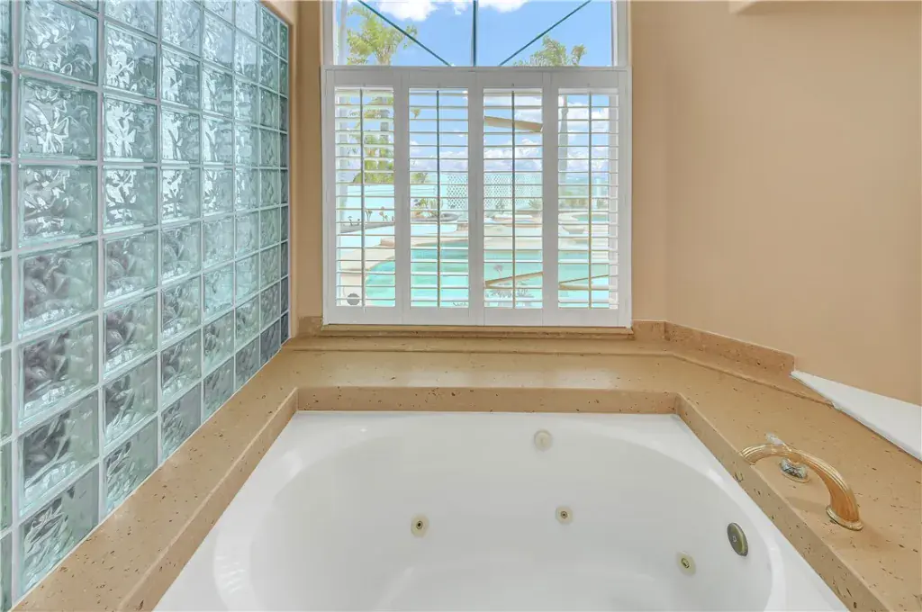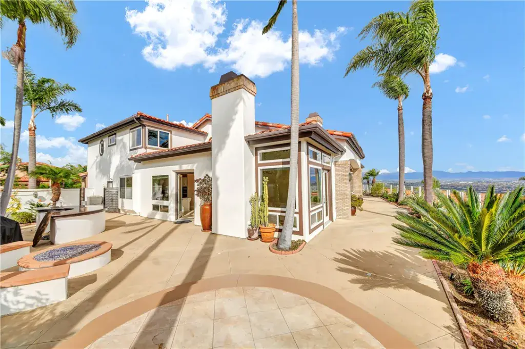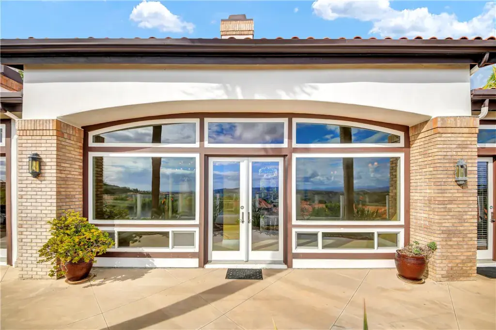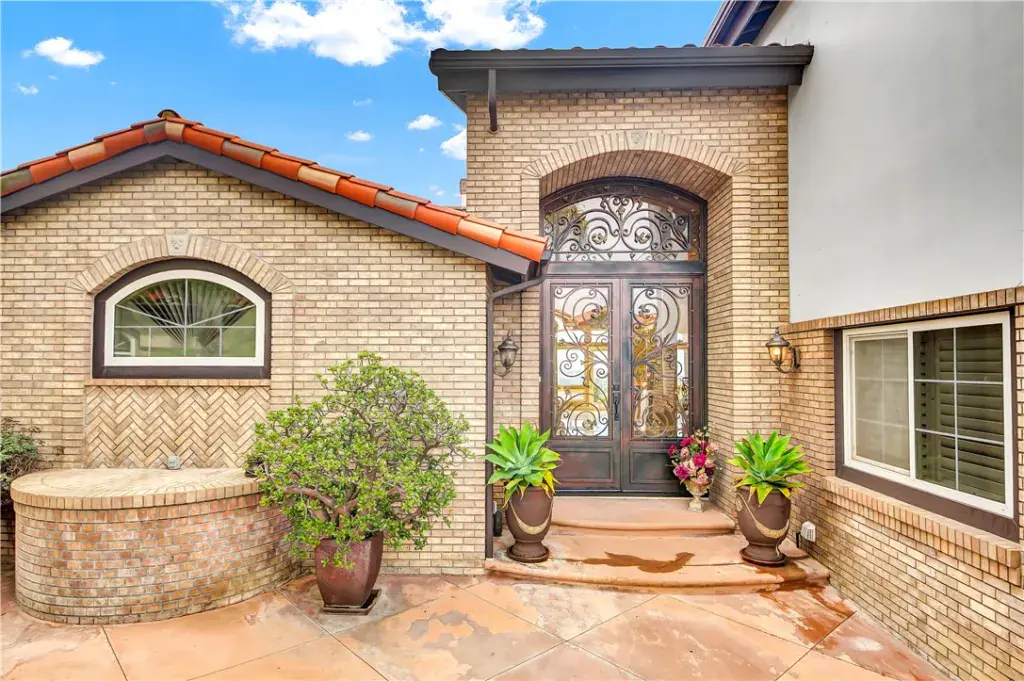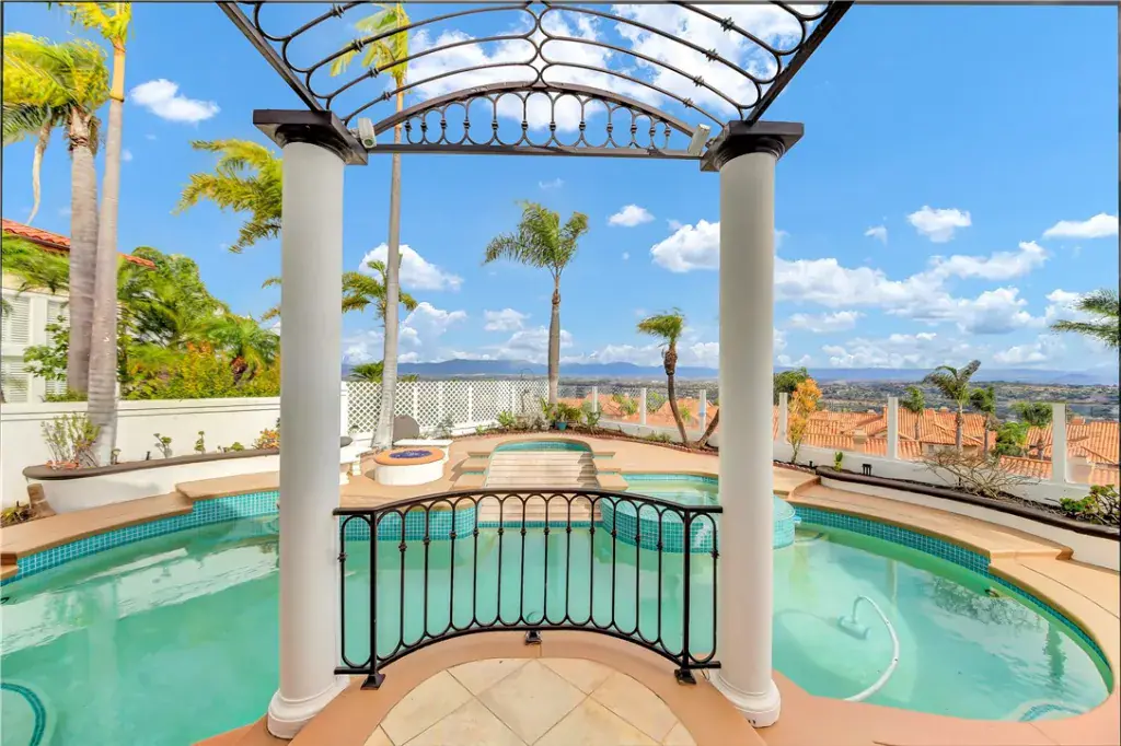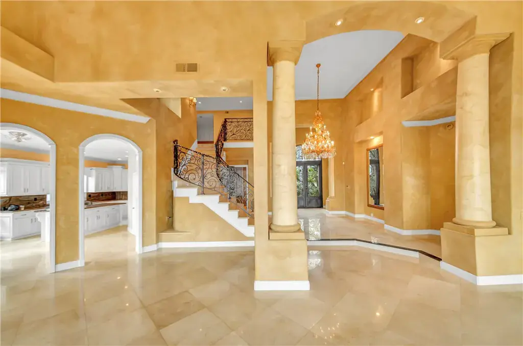 A dramatic two-story foyer welcomes you with imported Italian marble flooring, elegant wrought-iron staircase railings, and expansive sightlines through the main living areas, immediately highlighting the home’s exceptional views. The main-floor primary suite is a private retreat, offering a spa-like bath, fireplace, and direct access to the backyard and resort-style pool area.