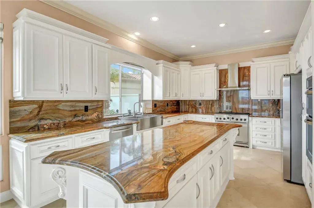 Throughout the home, refined Italian-inspired details abound, including hand-applied Venetian plaster walls, and exquisite Italian chandeliers, all complemented by abundant natural light. The gourmet kitchen is both elegant and functional, featuring granite countertops, a center island, custom cabinetry, a walk-in pantry, and stainless steel appliances.