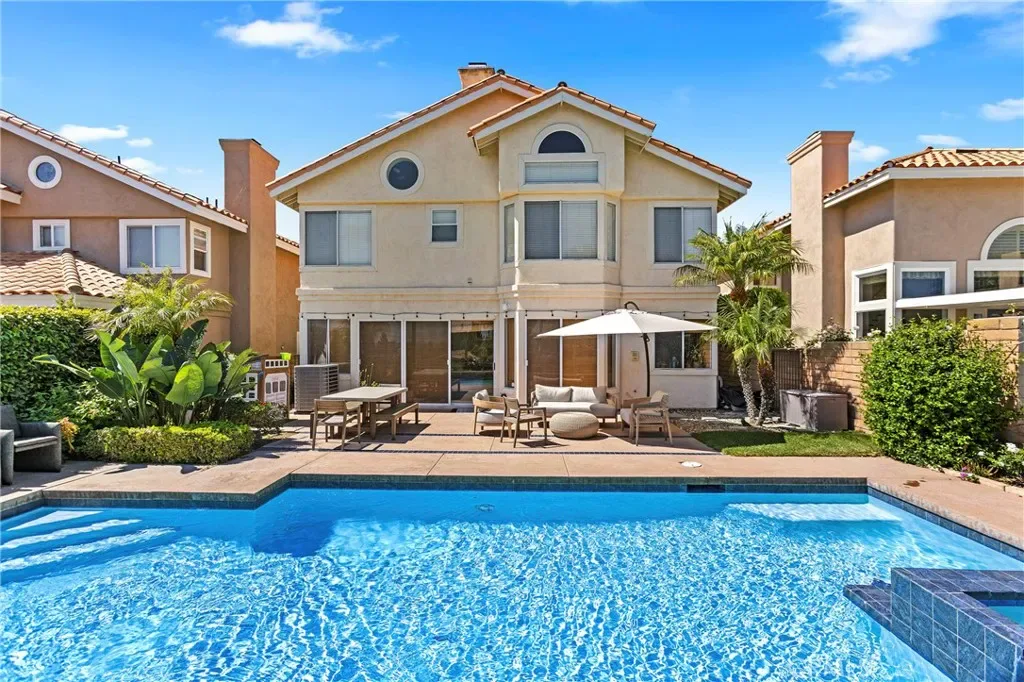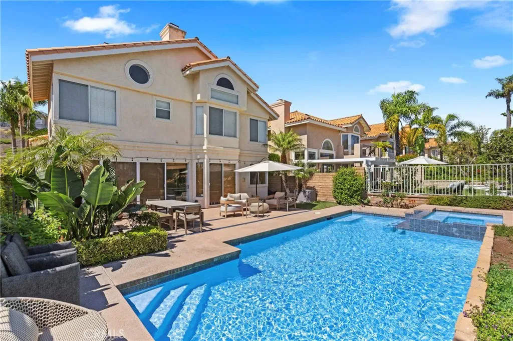 Say hello to this fabulous Niguel Summit Portofino property. This is the largest model at 2,798 square feet and includes pool, spa, & panoramic views of hills, city lights, peek-a-boo ocean view all on a single loaded street. 4 spacious bedrooms, 4 full baths and a 3 car oversized garage are just part of the allure to this lovely home. Primary suite includes panoramic views, double-sided fireplace, walk-in closet, walk-in shower & upgraded dual vanity. You’ll find 2 additional bedrooms upstairs each with their own bath with upgraded vanities. One secondary bedroom upstairs has it’s own door out to exterior leisure view deck. Downstairs includes main floor bedroom/office, hall bath with shower & upgraded vanity & mirror. Separate large laundry room with sink & French Door to exterior. Large living room with vaulted ceilings and two sided fireplace to Family Room & Kitchen area. Plantation shutters cover the multiple windows that allow abundant light into the whole property. Family Room opens to kitchen with nook area, counters are white quartz and window coverings are bamboo style shades. Flooring downstairs is a very light tile throughout. Sliding doors off Family Room lead to gorgeous pool & spa with forever views and lush, tropical landscaping. BONUS!!! – Electrical car charger in garage! This property is just minutes to the best shopping, beaches, restaurants, golf courses & beautiful Dana Point Harbor. Walking distance to Moulton Elementary School and property is located within Capistrano Unified School District. You can’t beat this Niguel Summit neighborhood with walking trails surrounding the whole area and just minutes to most everything. This home is the perfect combination for most any living situation.