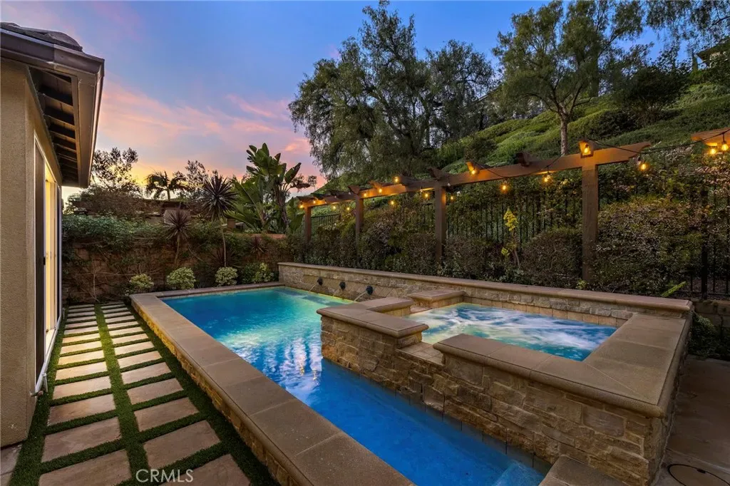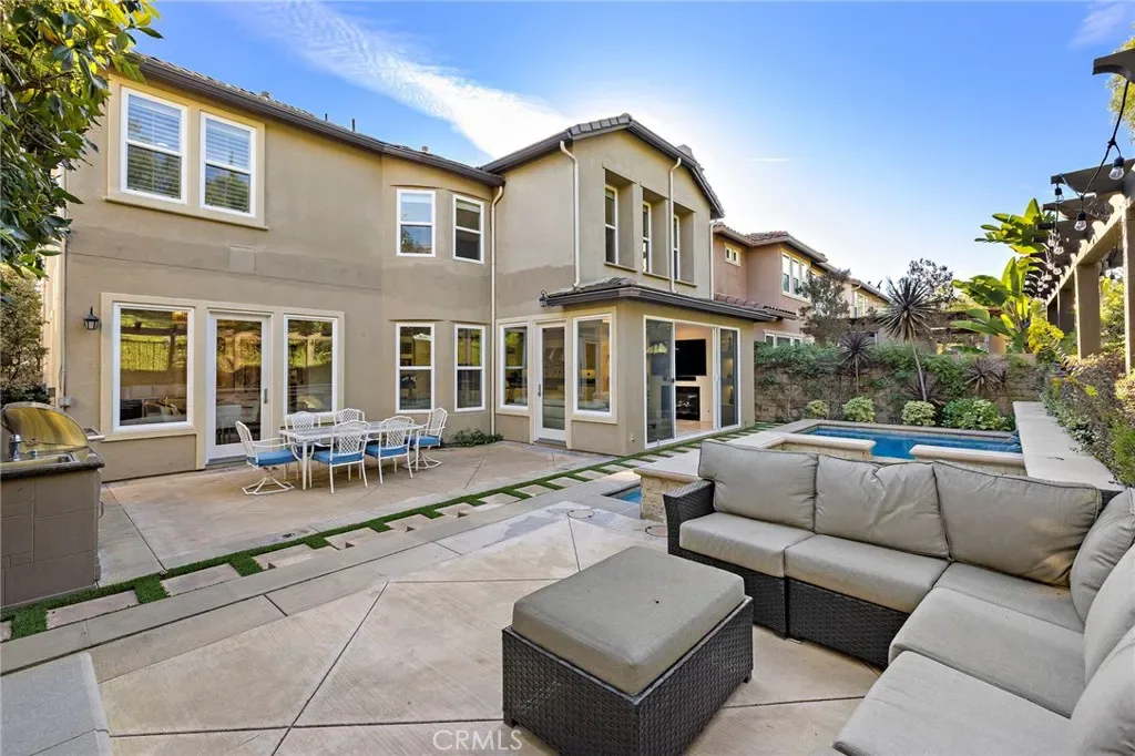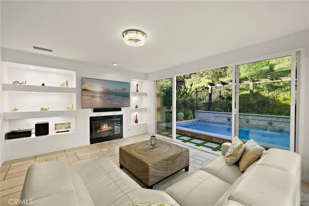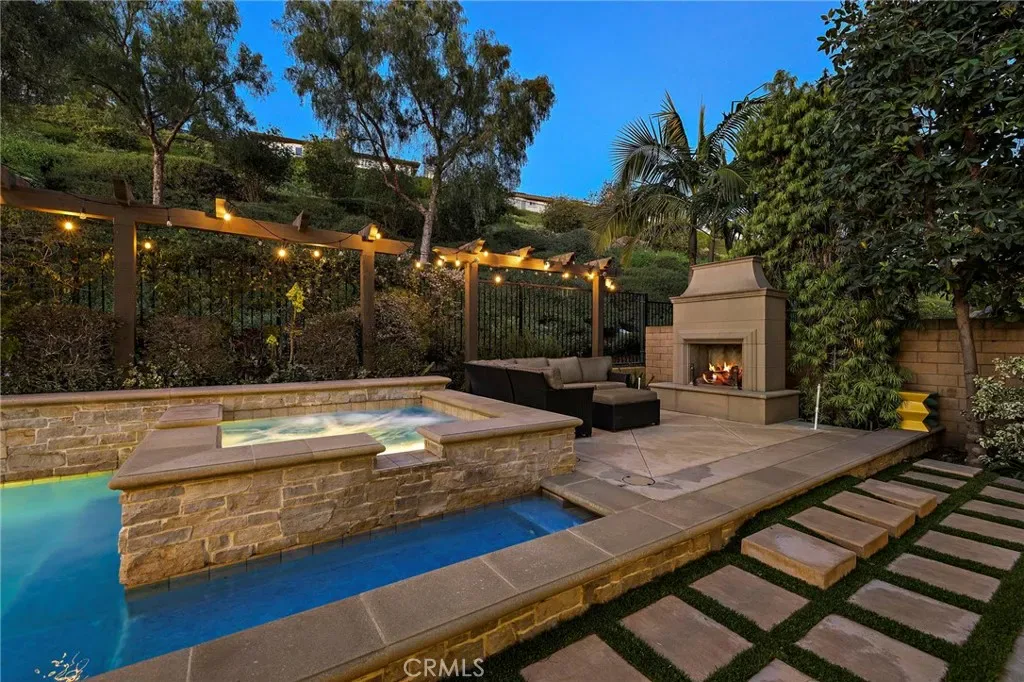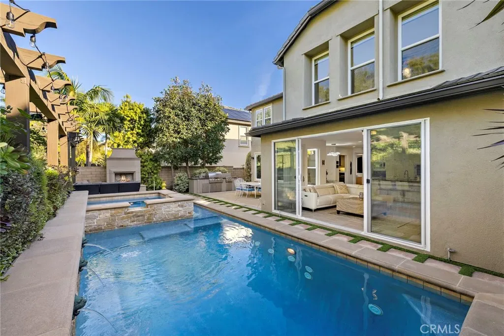 The backyard is a true resort-style sanctuary with a sparkling pool and spa, tranquil water features, built-in BBQ island, outdoor fireplace, and multiple areas for lounging and dining. Lush landscaping and mature trees provide privacy and an inviting setting for year-round outdoor enjoyment.